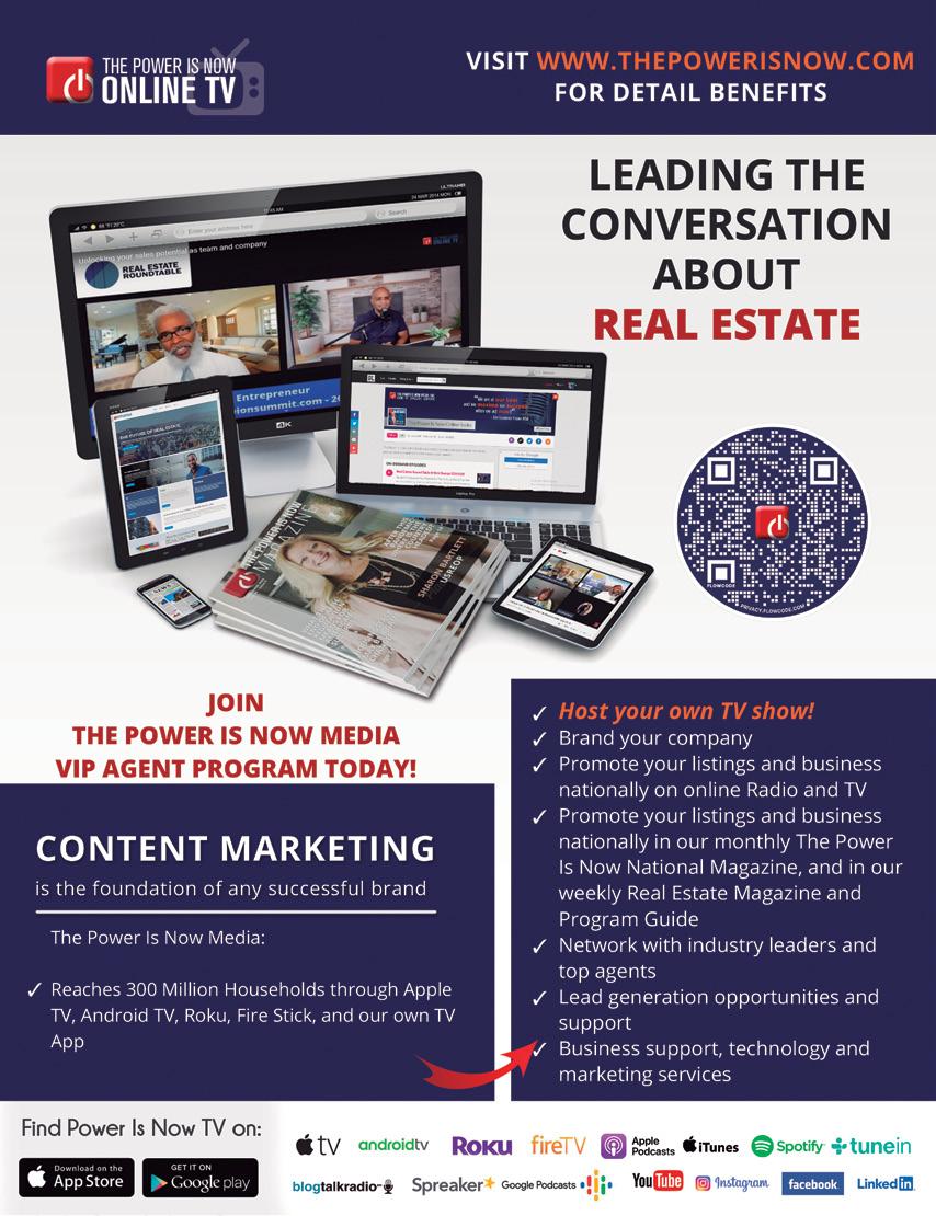 the power is now real estate magazine STAY UP-TO-DATE WITH THE POWER IS NOW MAGAZINES. SIMPLY SUBSCRIBE TODAY AND THE MAGAZINES WILL BE DELIVERED DIRECTLY TO YOUR E-MAIL INBOX. FOLLOW US ON SOCIAL MEDIA! Facebook Instagram LinkedIn Twitter Pinterest YouTube ActiveRain FOUNDER AND EDITORIAL DIRECTOR Eric Lawrence Frazier, MBA Office: (800) 401-8994 Ext. 703 Direct: (714) 361-2105 eric.frazier@thepowerisnow.com www.thepowerisnow.com www.blogtalkradiocom/thepowerisnow EDITOR IN CHIEF Sheila Gilmore MANAGING EDITOR Daniels George CREATIVE DIRECTOR Goldy Ponce Arratia CONTACT info@thepowerisnow.com (800) 401-8994 ext. 701