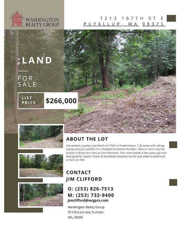 LIST PRICE: $152,500 18201 70TH AVENUE CT E, PUYALLUP, WA 98375 Make your own statement, ready for someone to build a home that fits their style and desire in a subdivision where the house you build can stand out and show your pride and ability. Located just south of 176th between Canyon Road and Meridian so effortless commute to all the services and shopping. This property may qualify for Seller Financing see listing supplements. Offers are to be input on the seller’s offer webpage. Agent must register as a user enter the address and click “Start Offer”. Back to Table of Contents CALL ME FOR DETAILS: JIM CLIFFORD O: (253) 826-7513 M: (253) 732-9400 jimclifford@wrgpra.com