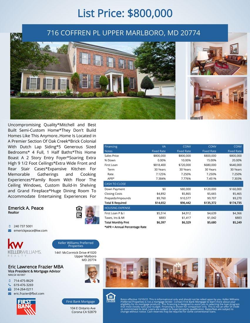 LISTED FOR $800,000 716 Coffren Pl Upper Marlboro, MD 20774 Property Information Uncompromising Quality*Mitchell and Best Built Semi-Custom Home*They Don’t Build Homes Like This Anymore..Home Is Located in A Premier Section Of Oak Creek*Brick Colonial With Dutch Lap Siding*5 Generous Sized Bedrooms* 4 Full, 1 Half Baths*This Home Boast A 2 Story Entry Foyer*Soaring Extra High 9 1/2 Foot Ceilings*Extra Wide Front and Rear Stair Cases*Expansive Kitchen For Memorable Gatherings and Cooking Experiences*Family Room With Floor The Ceiling Windows, Custom Build-In Shelving and Grand Fireplace* CALL ME FOR INFORMATION Emerick Peace NMLSID: 320004 Phone number: (240) 882-0198 Email: EmerickPeace@KW.com