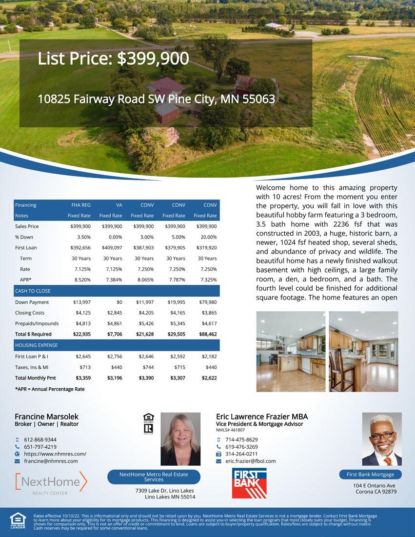 LIST PRICE: $399,900 10825 FAIRWAY ROAD SW PINE CITY, MN 55063 Welcome home to this amazing property with 10 acres! From the moment you enter the property, you will fall in love with this beautiful hobby farm featu ring a 3 bedroom, 3.5 bath home with 2236 fsf that was constructed in 2003, a huge, historic barn, a newer, 1024 fsf heated shop, several sheds, and abun dance of privacy and wildlife. The beautiful home has a newly finished walkout basement with high ceilings, a large family room, a den, a bedroom, and a bath. The fourth level could be finished for additional square footage. D: (612) 868-9344 C: (651) 797-4219 francine@nhmres.com https://www.nhmres.com/ 7309 Lake Dr, Lino Lakes, MN 55014 229 Jackson St, Ste B, Anoka, MN 55303 *Each office is individually owned and operated.* CALL ME FOR INFORMATION FRANCINE MARSOLEK Broker | Owner | Realtor