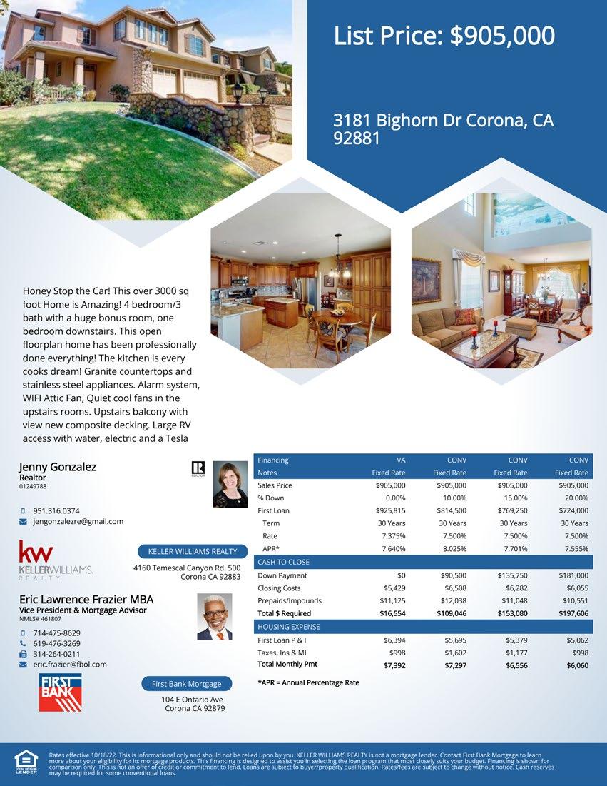 THE INFLATION REDUCTION ACT WILLS HELP FAMILIES STEER THROUGH TOUGH TIMES, BUT WHAT ARE ITS LONG-TERM IMPACTS? page 6 FEATURED LISTING! 3181 Bighorn Dr Corona, CA 92881 Listing Agent: Jenny Gonzalez Keller Williams Corona the power is now REAL ESTATE MAGAZINE OCTOBER 17, 2022