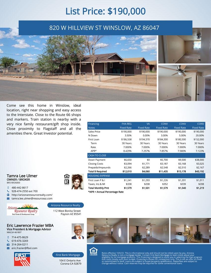 LISTED FOR $190,000 820 W Hillview St, Winslow, AZ 86047 PROPERTY INFORMATION Come see this home in Winslow, ideal location, right near shopping and easy access to the Interstate. Close to the Route 66 shops and markers. Train sta tion is nearby with a very nice family restaurant/gift shop inside. Close proxi mity to Flagstaff and all the amenities there. Great Investor potential. Call Tamra Lee Ulmer Owner | Broker BR518926000 o: (928) -474-2550 ext 700 tamra.lee.ulmer@resourceaz.com http://arizonaresourcerealty.com/