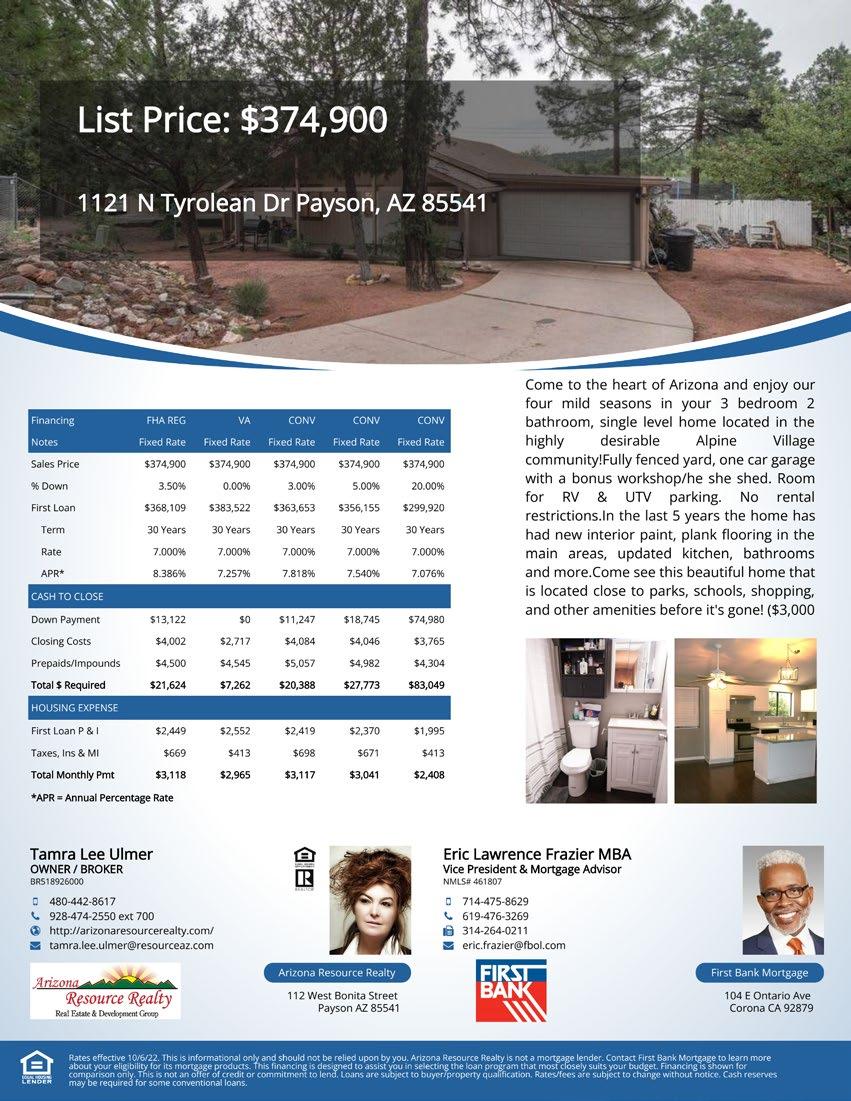 LIST PRICE $374,900 Description Come to the heart of Arizona and enjoy our four mild seasons in your 3 bedroom 2 bathroom, single level home located in the highly desirable Alpine Village community!Fully fenced yard, one car garage with a bonus workshop/he she shed. Room for RV & UTV parking. No rental restrictions.In the last 5 years the home has had new interior paint, plank flooring in the main areas, updated kitchen, bathrooms and more.Come see this beautiful home that is located close to parks, schools, shopping, and other amenities before it's gone! ($3,000 carpet allowance being offered)Call to schedule your showing today. CALL TAMRA LEE ULMER (480) 689 6258