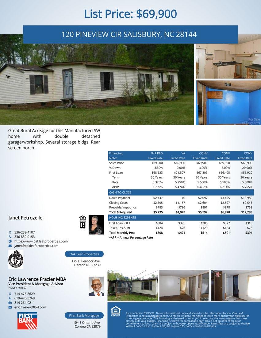 120 Pineview Cir Salisbury, NC 28144 SINGLE FAMILY HOME FOR SALE LIST PRICE $69,900 CALL FOR DETAILS JANET PETROZELLE JANET R. PETROZELLE Oak Leaf Properties 175 E. Peacock Ave Denton, NC 27239 Office: 336-859-0153 Cell: 336-239-4107 Email: janet@oakleafproperties.com 2 BEDROOMS 2 BATHROOMS 2 CAR GARAGE PROPERTY INFORMATION: Great Rural Acreage for this Manufactured SW home with double detached garage/workshop. Several storage bldgs. Rear screen porch. PROPERTY INFORMATION: