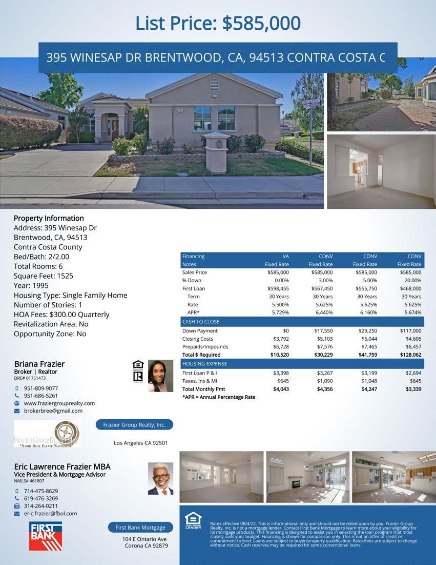 LISTED FOR $585,000 395 Winesap Dr Brentwood, CA, 94513 Property Information Bed/Bath: 2/2.00 Total Rooms: 6 Square Feet: 1525 Year: 1995 Housing Type: Single Family Home Lot Size: 5900.00 sq ft Call Briana Frazier Realtor DRE#01751773 mobile: (951) 809-9077 e-mail: brokerbree@fraziergrouprealty.com