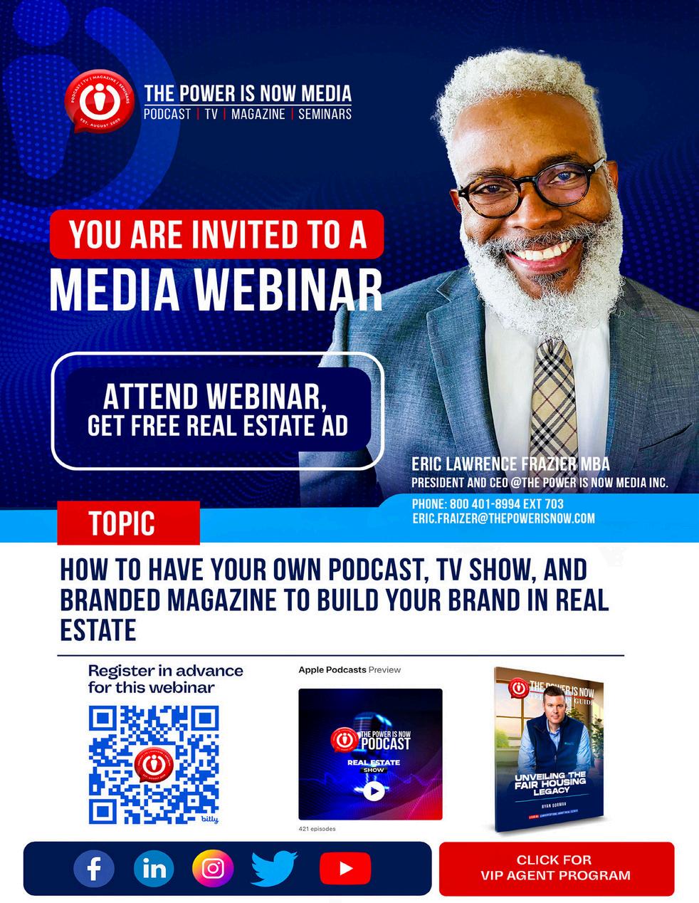 The Power Is Now Media is an online multimedia company founded in 2009 by Eric L. Frazier and is headquartered in Riverside, California. We are advocates for home- ownership, wealth building and financial literacy for low to moderate-income and minority communities. We utilize online Radio, online Magazine, online TV and online events to educate and support the American dream of homeownership and financial independence. We are supported by numerous national and state real estate asso- ciations and community groups and provides weekly real estate related content to millions of real estate agents and consumers throughout the United States online and by webinars. The Power Is Now Media Inc. corporate office is located at 3739 6th Street Riverside, CA 92501.