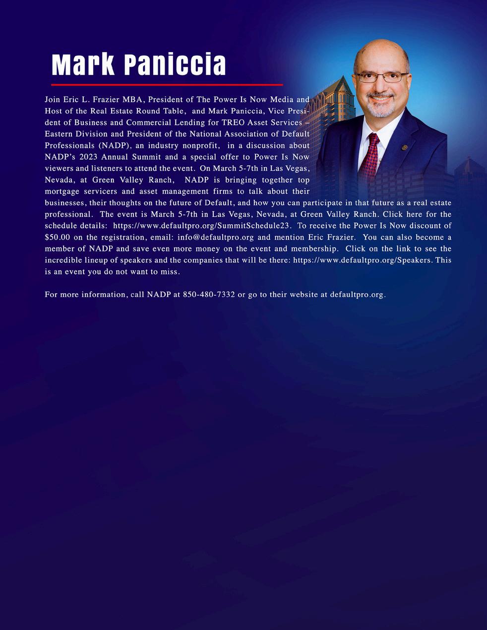 Join Eric L Frazier MBA, President of The Power Is Now Media and Host of the Real Estate Round Table, and Mark Paniccia, Vice President of Business and Commercial Lending for TREO Asset Services – Eastern Division and President of the National Association of Default Professionals (NADP), an industry nonprofit, in a discussion about NADP’s 2023 Annual Summit that took place on March 5-7th in Las Vegas, Nevada, at Green Valley Ranch. NADP brought together top mortgage servicers and asset management firms to talk about their businesses and their thoughts on the future of Default. In this episode, Mark Panniccia provides an overview of the conference and he what he learned about the future of REO. We start the show by talking about the needs of his company TREO Asset Services, and the benefit of membership in NADP. By becoming a member of NADP, you save even more money on future events Click on the link to see the incredible lineup of speakers and the companies that attended the event https://www defaultpro org/Speakers Next year make NADP a part of your conference scheduled For more information, call NADP at 850-480-7332 or go to their website at defaultpro org