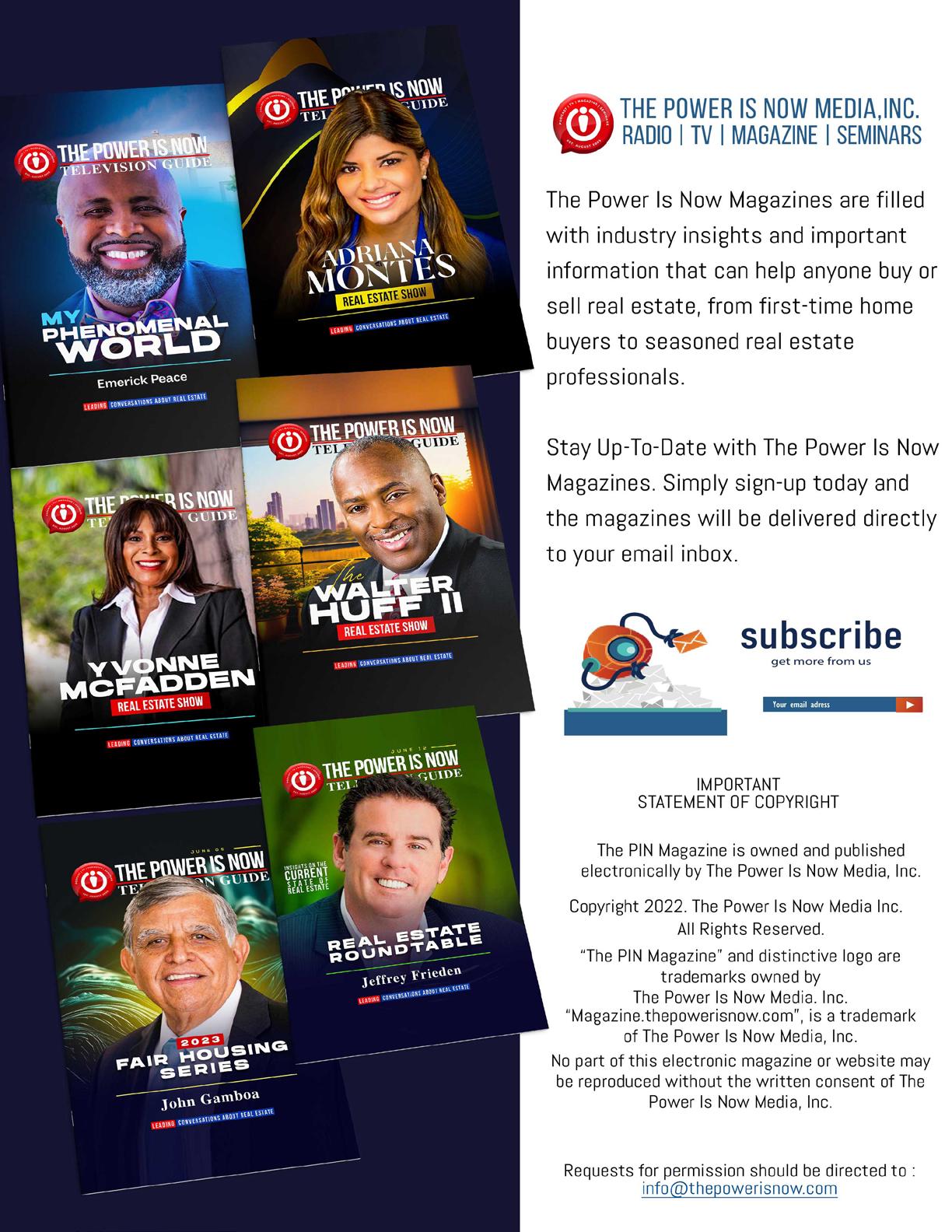 The Power Is Now Media is an online multimedia company founded in 2009 by Eric L. Frazier and is headquartered in Riverside, California. We are advocates for homeownership, wealth building and financial literacy for low to moderate-income and minority communities. We utilize online Radio, online Magazine, online TV and online events to educate and support the American dream of homeownership and financial independence. We are supported by numerous national and state real estate associations and community groups and provides weekly real estate related content to millions of real estate agents and consumers throughout the United States online and by webinars. The Power Is Now Media Inc. corporate office is located at 3739 6th Street Riverside, CA 92501.