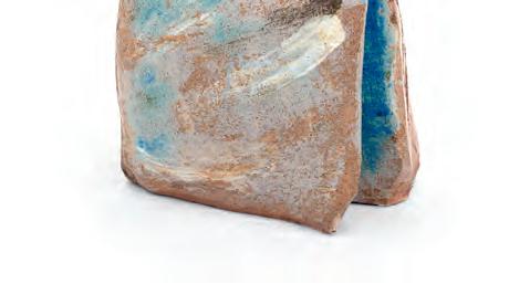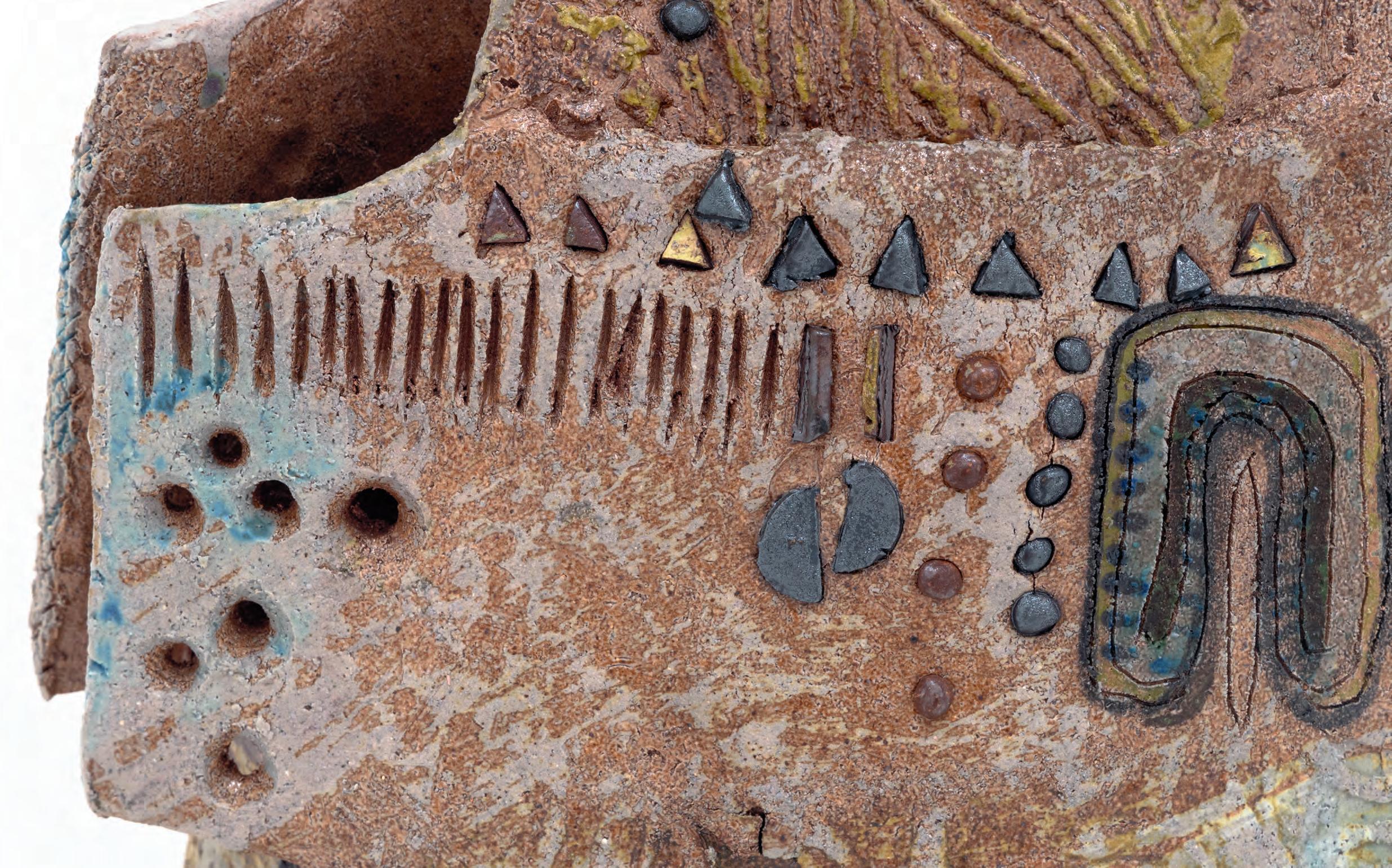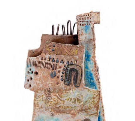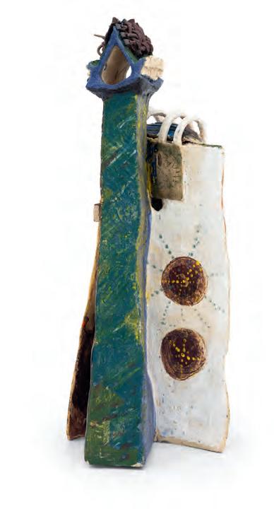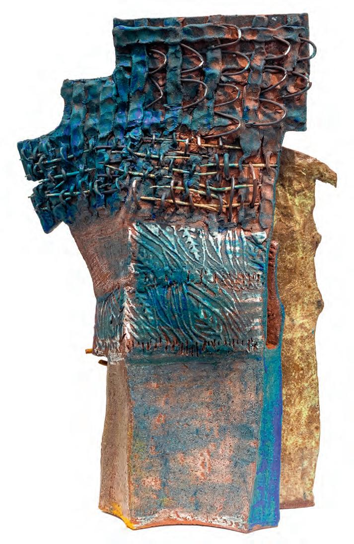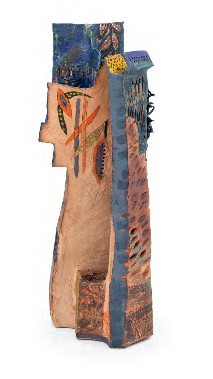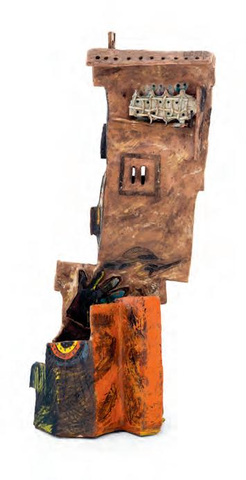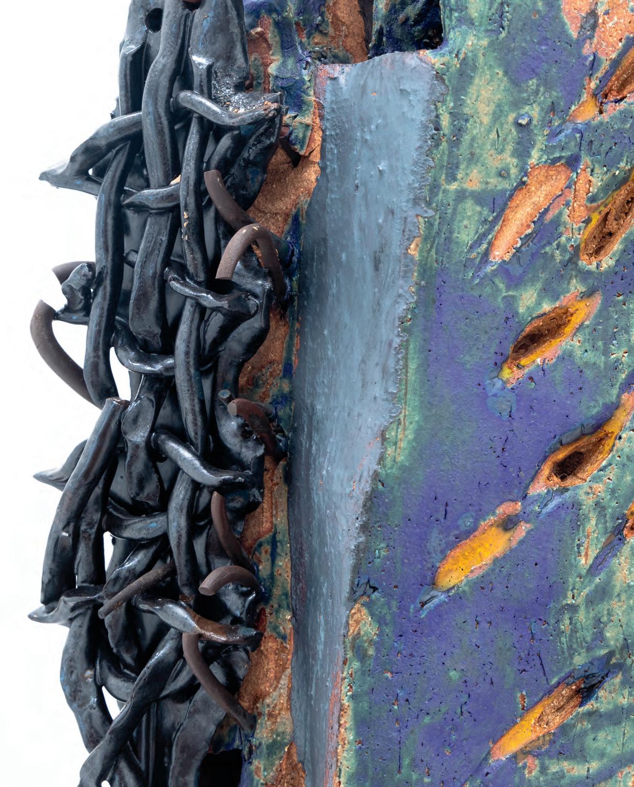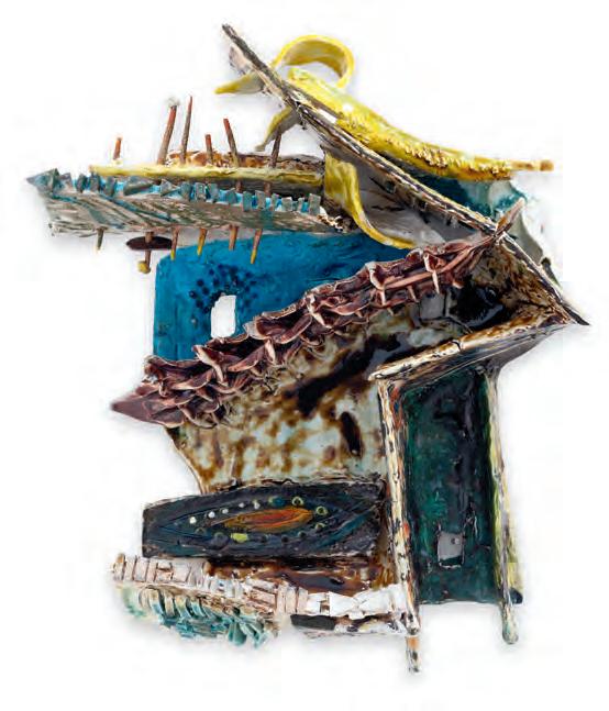 nails and discs that look like metal along with other objects and markings that clash or complement her sculpture’s glazes. House Series #24 (pl. 19), glazed blue and rust, features a circular band with woven parts, with those metallic looking objects—it’s like a weird 3D trompe-l’œil. These interruptions can be playful or whimsical or terrifying depending on their shapes and sizes. Why pierce the House skin? What do these sometimes large, sometimes small interruptions on the sculpture’s body say about the fragility, vulnerability of structures?