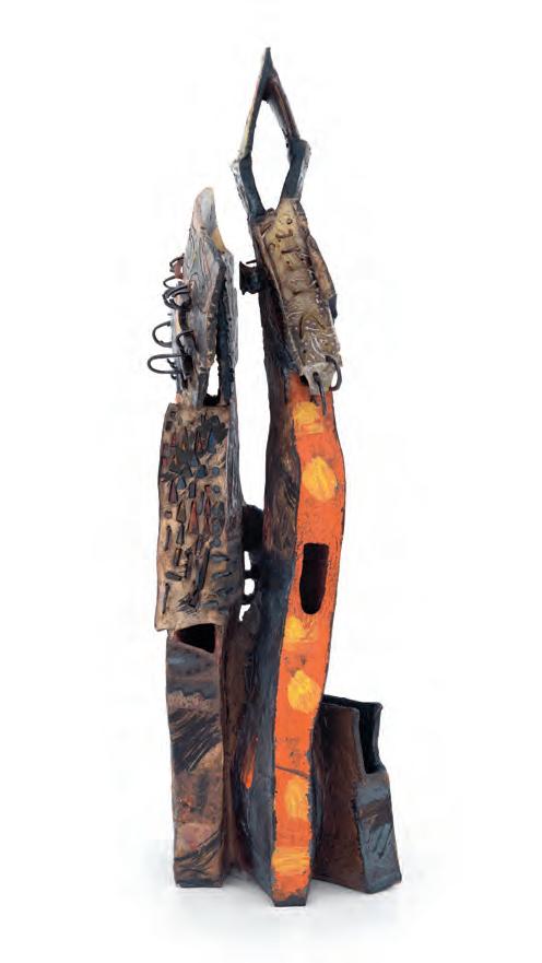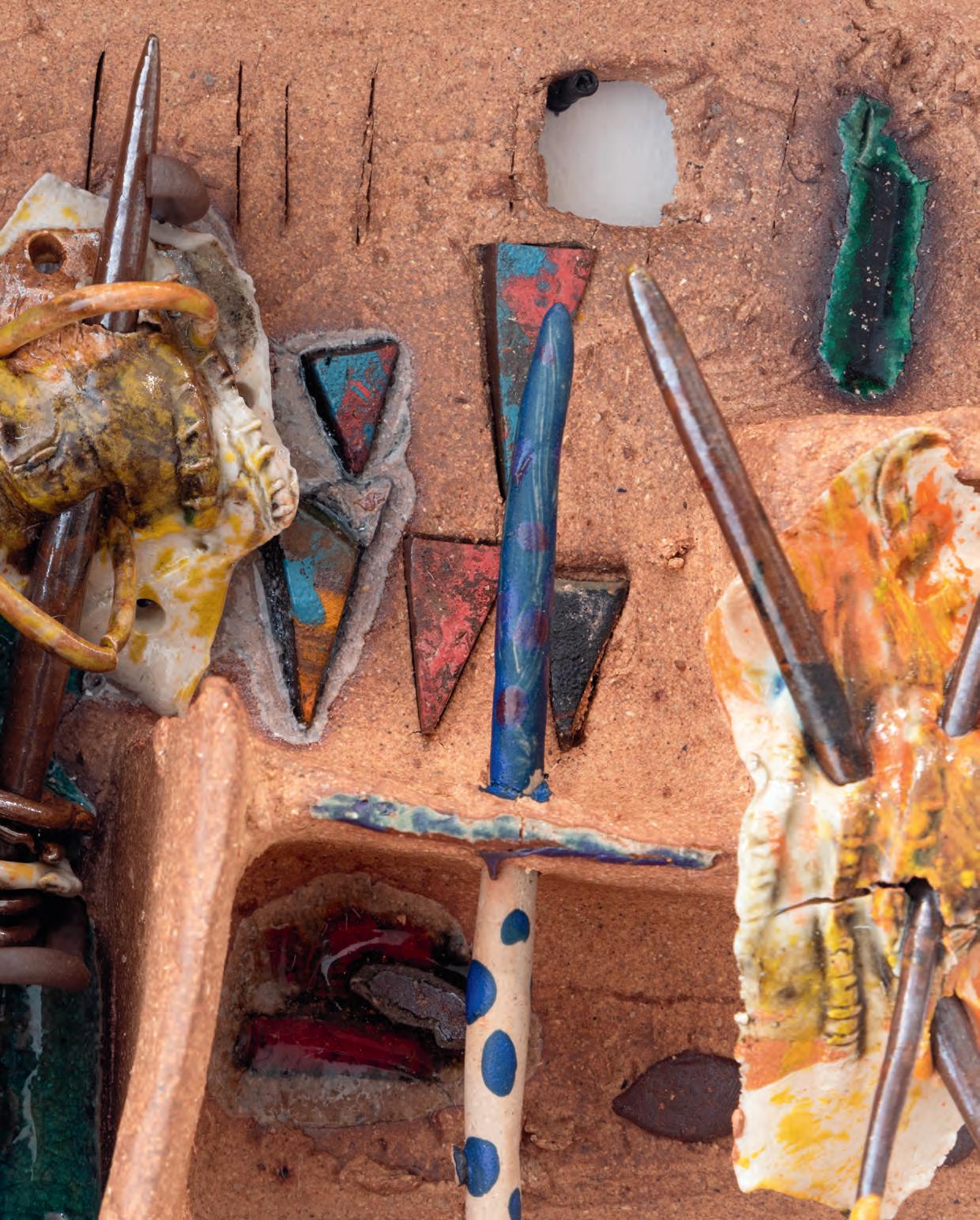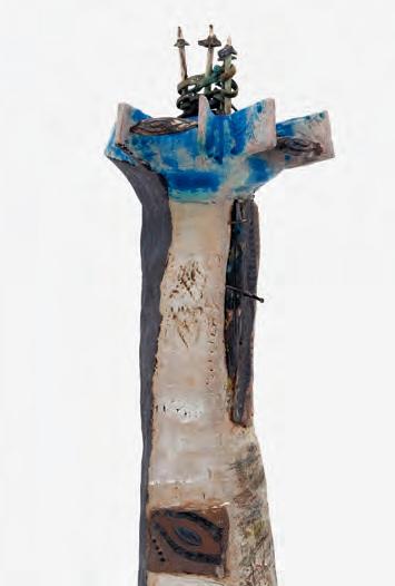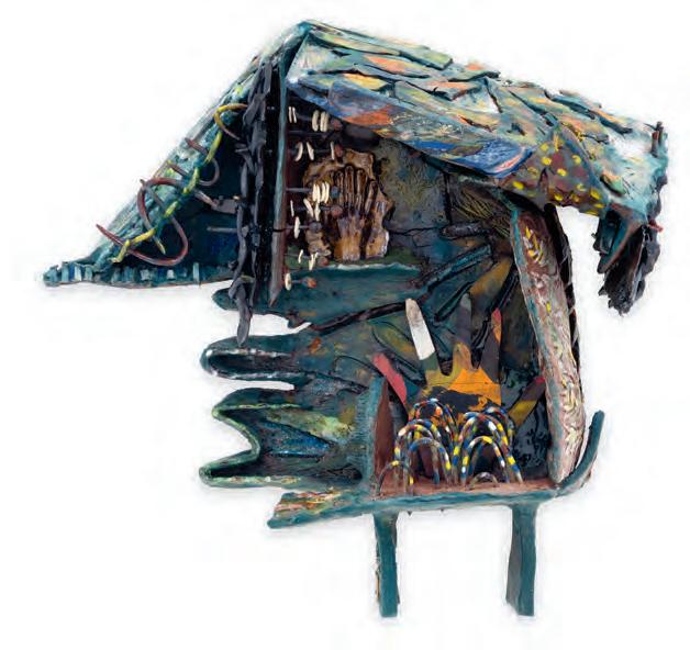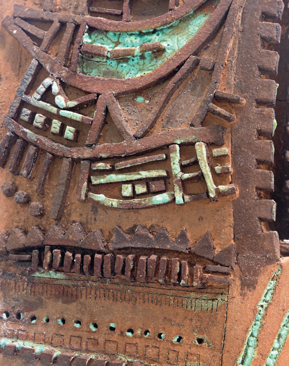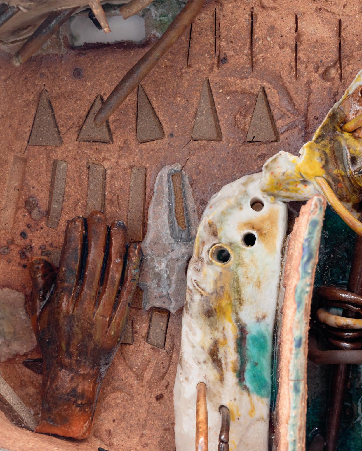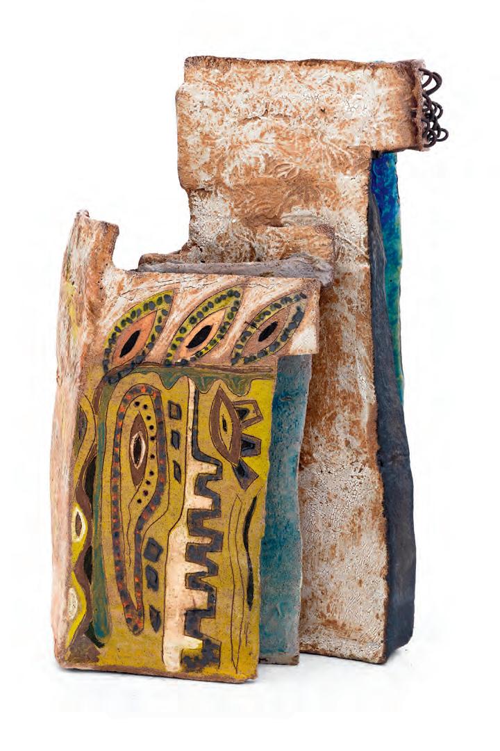 nails and discs that look like metal along with other objects and markings that clash or complement her sculpture’s glazes. House Series #24 (pl. 19), glazed blue and rust, features a circular band with woven parts, with those metallic looking objects—it’s like a weird 3D trompe-l’œil. These interruptions can be playful or whimsical or terrifying depending on their shapes and sizes. Why pierce the House skin? What do these sometimes large, sometimes small interruptions on the sculpture’s body say about the fragility, vulnerability of structures?
