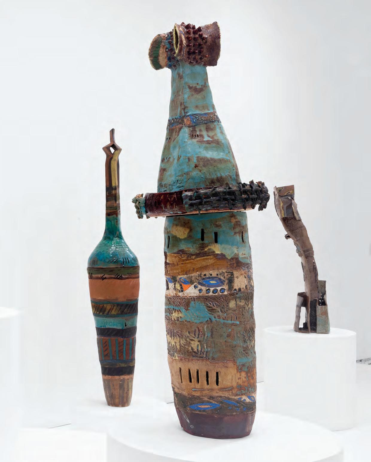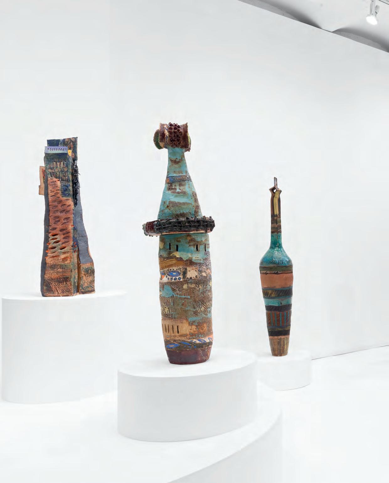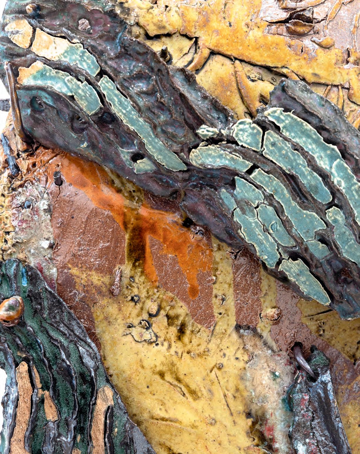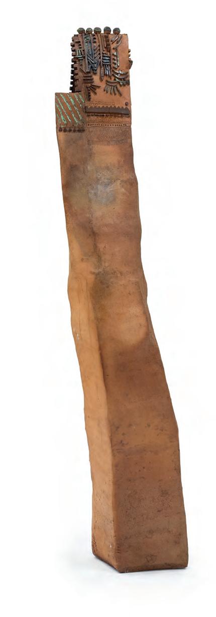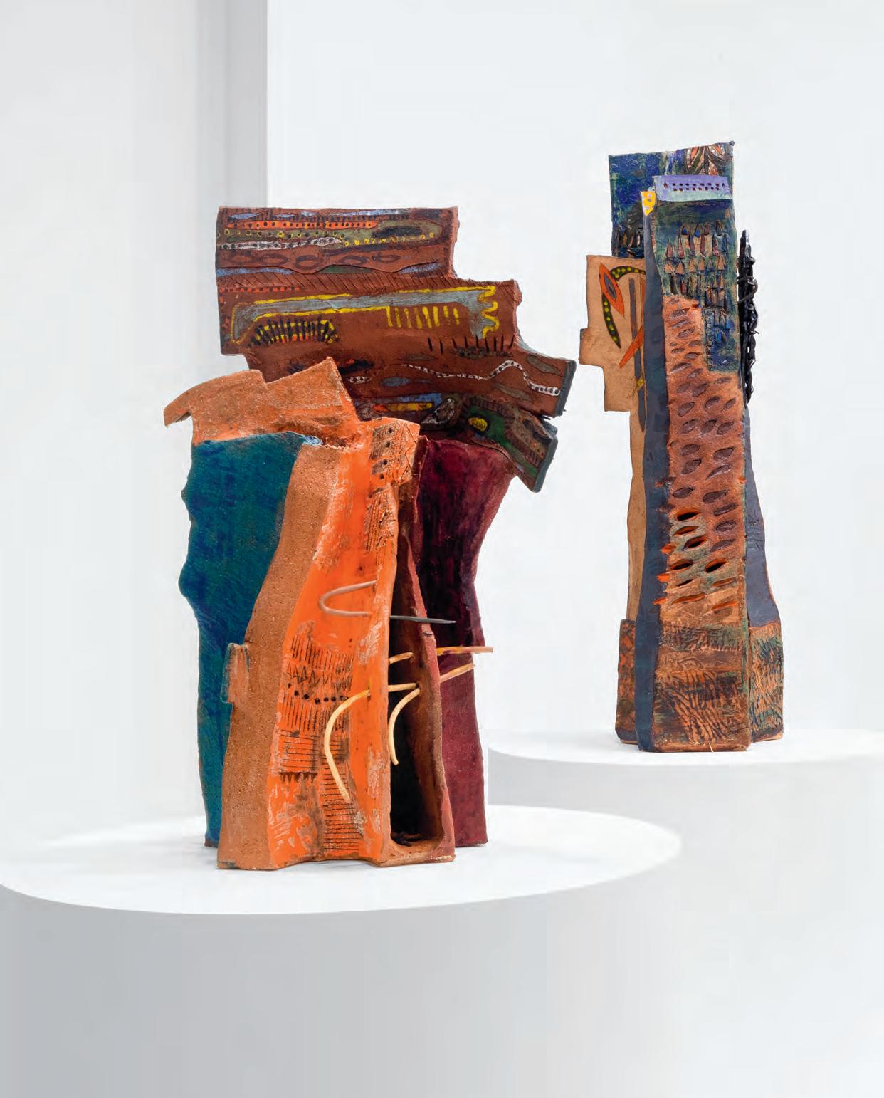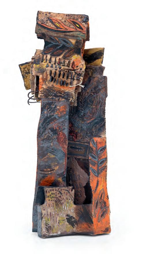 nails and discs that look like metal along with other objects and markings that clash or complement her sculpture’s glazes. House Series #24 (pl. 19), glazed blue and rust, features a circular band with woven parts, with those metallic looking objects—it’s like a weird 3D trompe-l’œil. These interruptions can be playful or whimsical or terrifying depending on their shapes and sizes. Why pierce the House skin? What do these sometimes large, sometimes small interruptions on the sculpture’s body say about the fragility, vulnerability of structures?