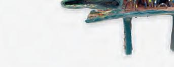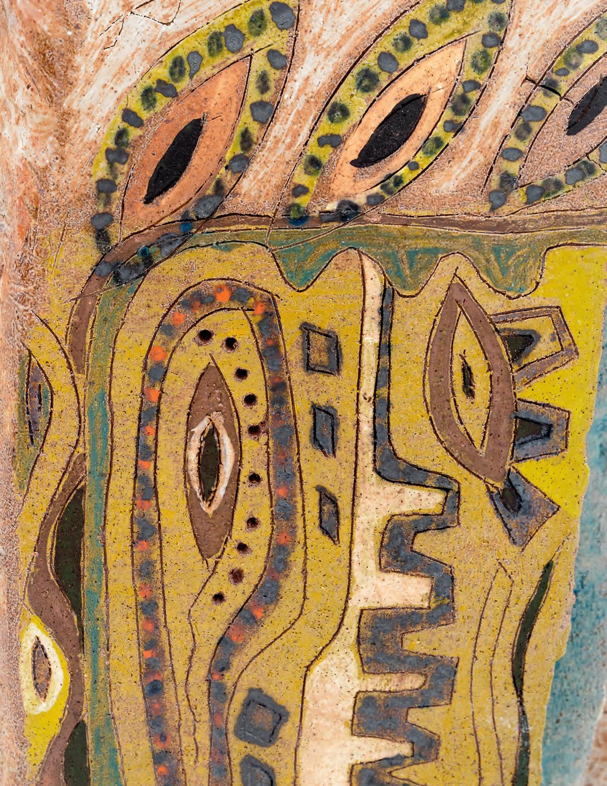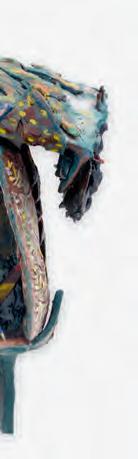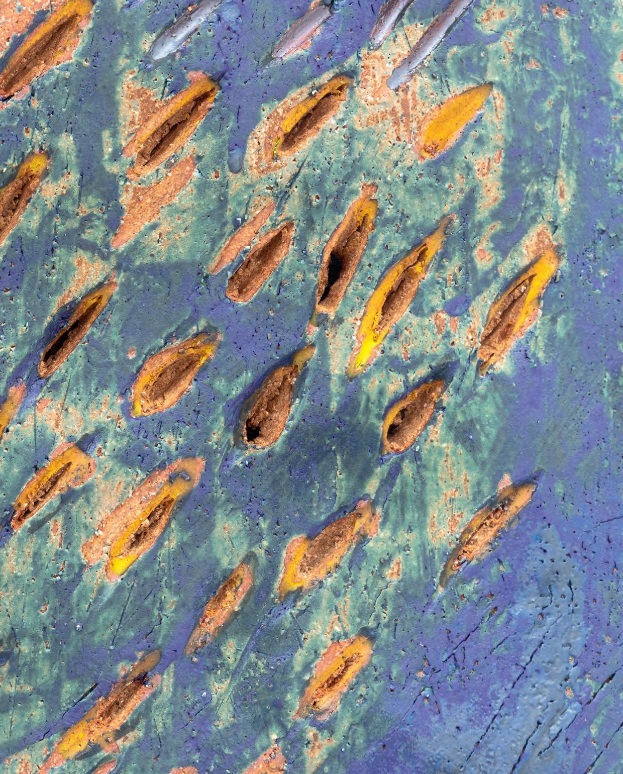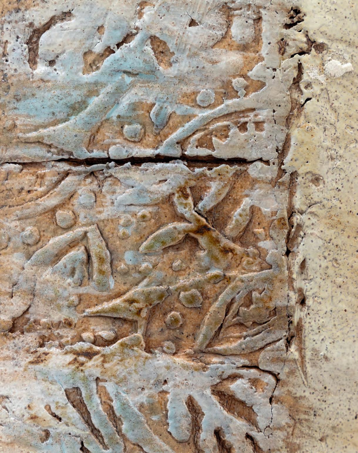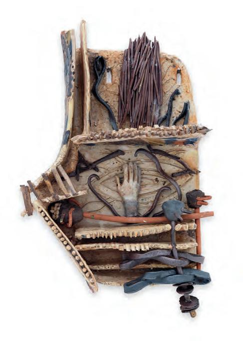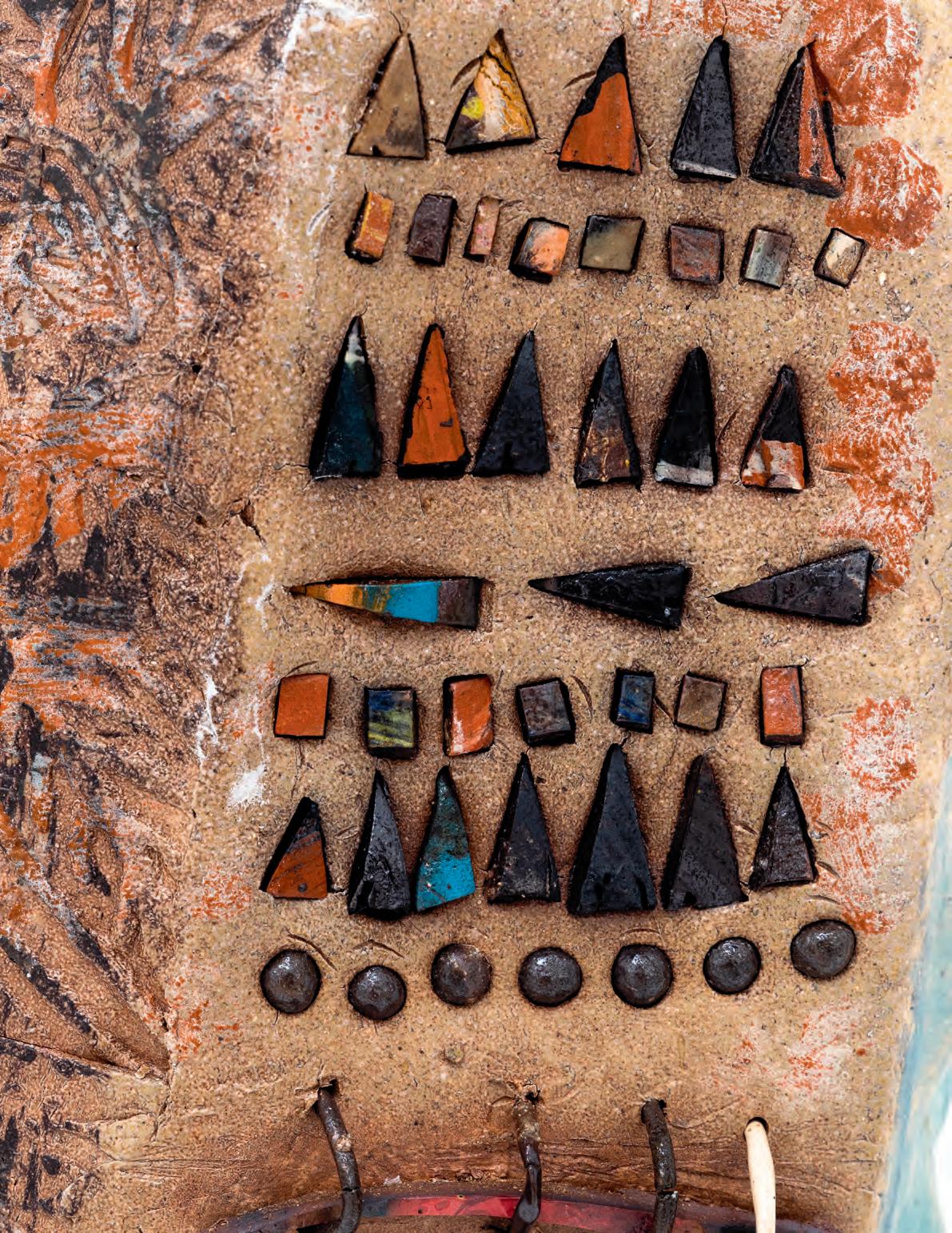 nails and discs that look like metal along with other objects and markings that clash or complement her sculpture’s glazes. House Series #24 (pl. 19), glazed blue and rust, features a circular band with woven parts, with those metallic looking objects—it’s like a weird 3D trompe-l’œil. These interruptions can be playful or whimsical or terrifying depending on their shapes and sizes. Why pierce the House skin? What do these sometimes large, sometimes small interruptions on the sculpture’s body say about the fragility, vulnerability of structures?