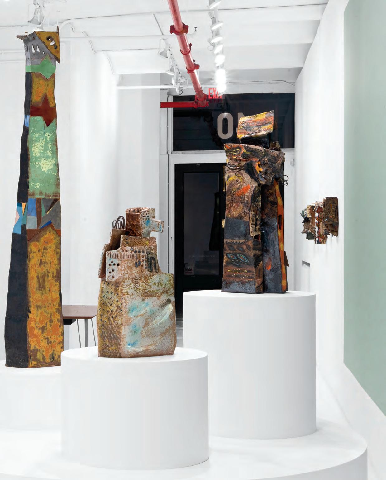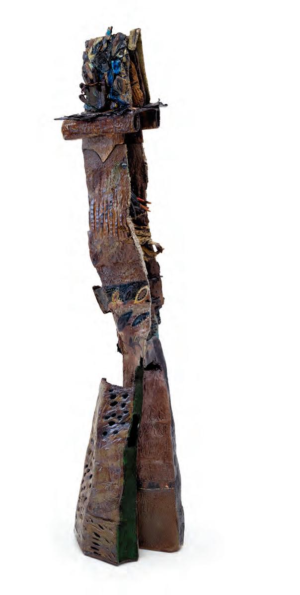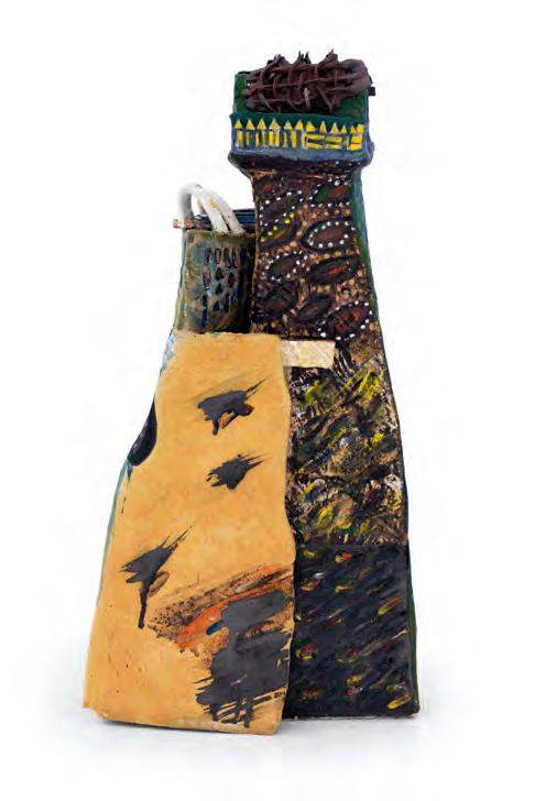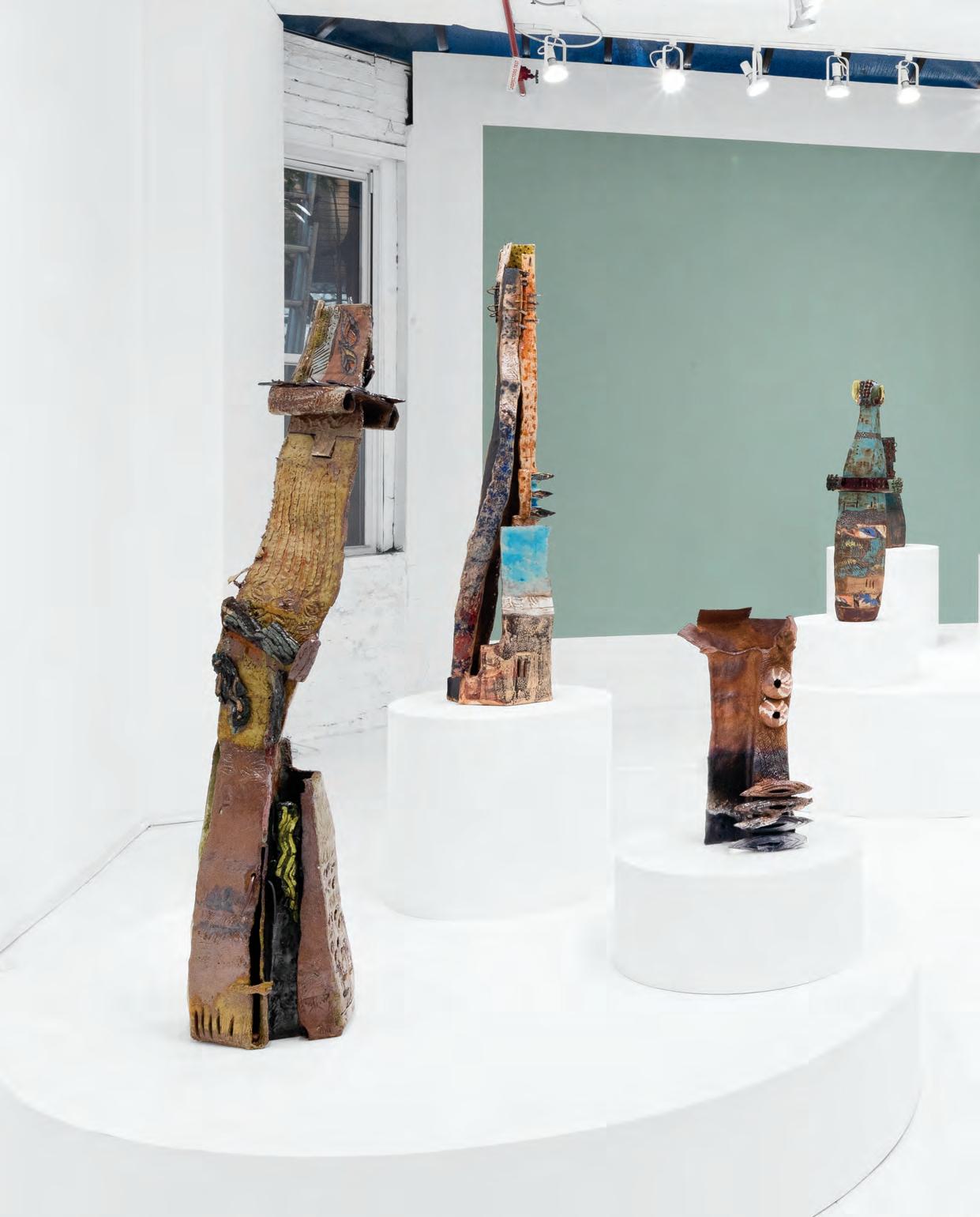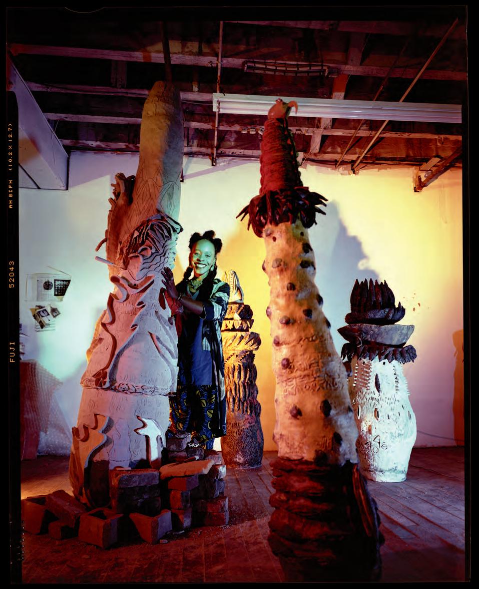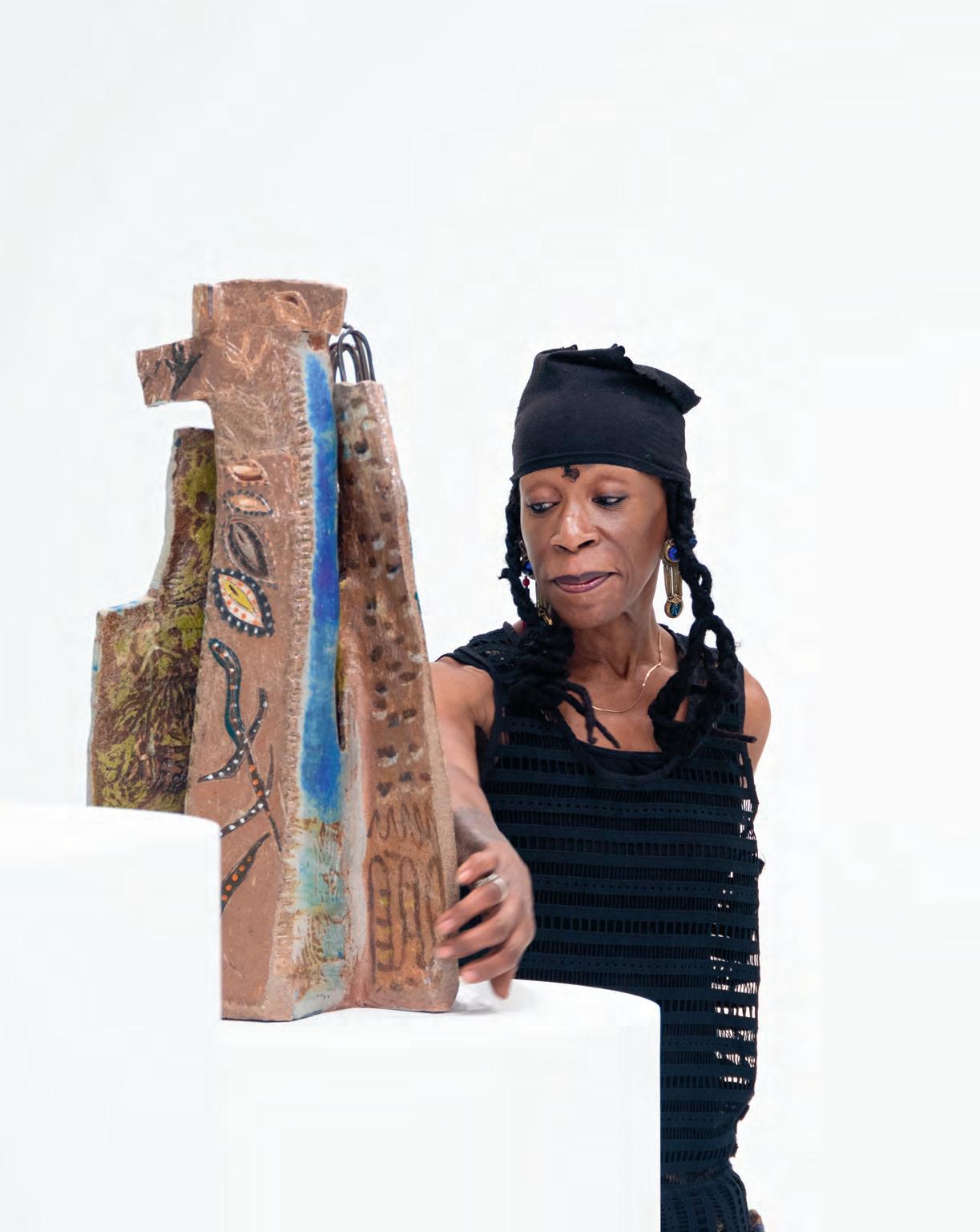 On a bright, hot August day I took the LIRR to Jamaica Center and Ubered to St. Albans, a storied African American community in Southwestern Queens. Queens has boulevards wider than the ones in Paris, and St. Albans has some show piece houses next to more modest dwellings. All have that house proud stamp— pretty gardens, trimmed lawns, portals that announce, “you have arrived.” Then I get to the home of Sana Musasama and her red brick front home where the yard announces a di erent way to garden, one not so trim, not so pretty, not so tidy. Not at all. This modest structure is clearly the home of an artist, and with that it has the challenges and charms that a childhood home, now artist’s studio, contains. In this building, there is groundedness and unease, similar to the tilts of some of her stoneware sculptures with their nods to the precarity of shelter. How di cult it can be to achieve it, how so very easily it can go.