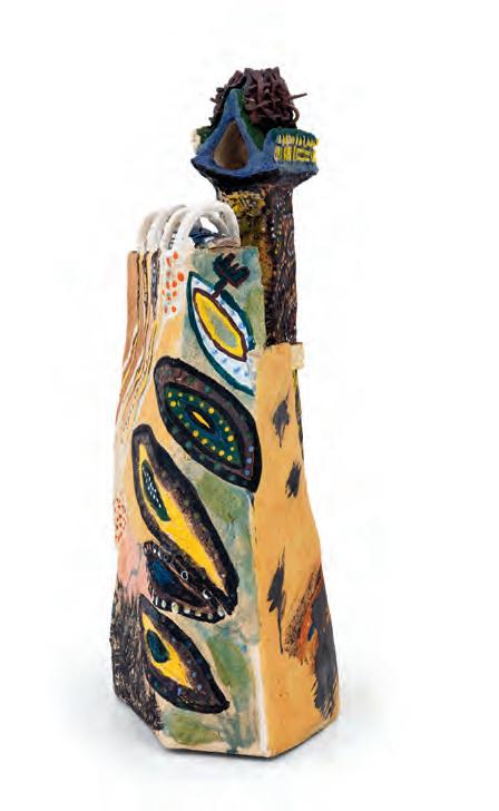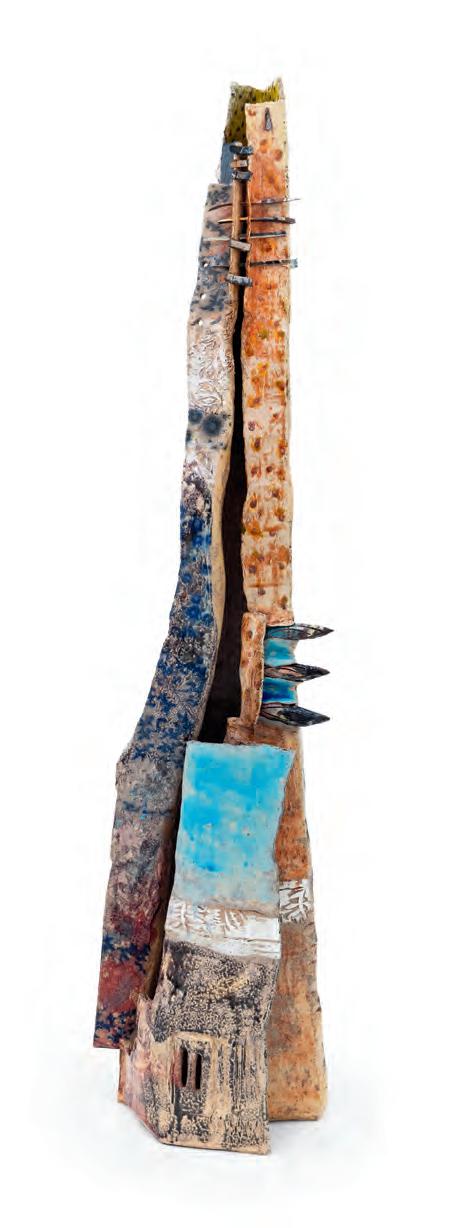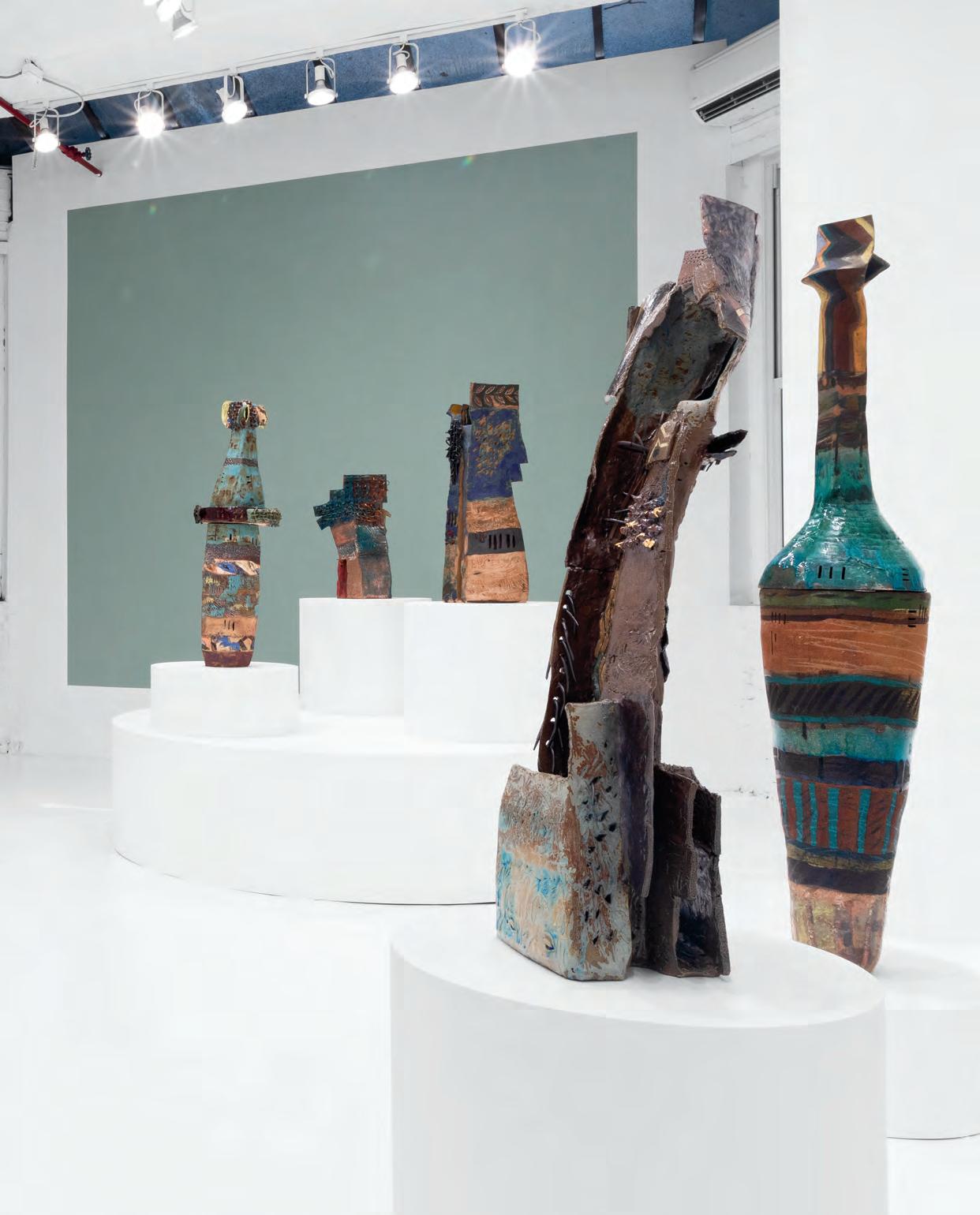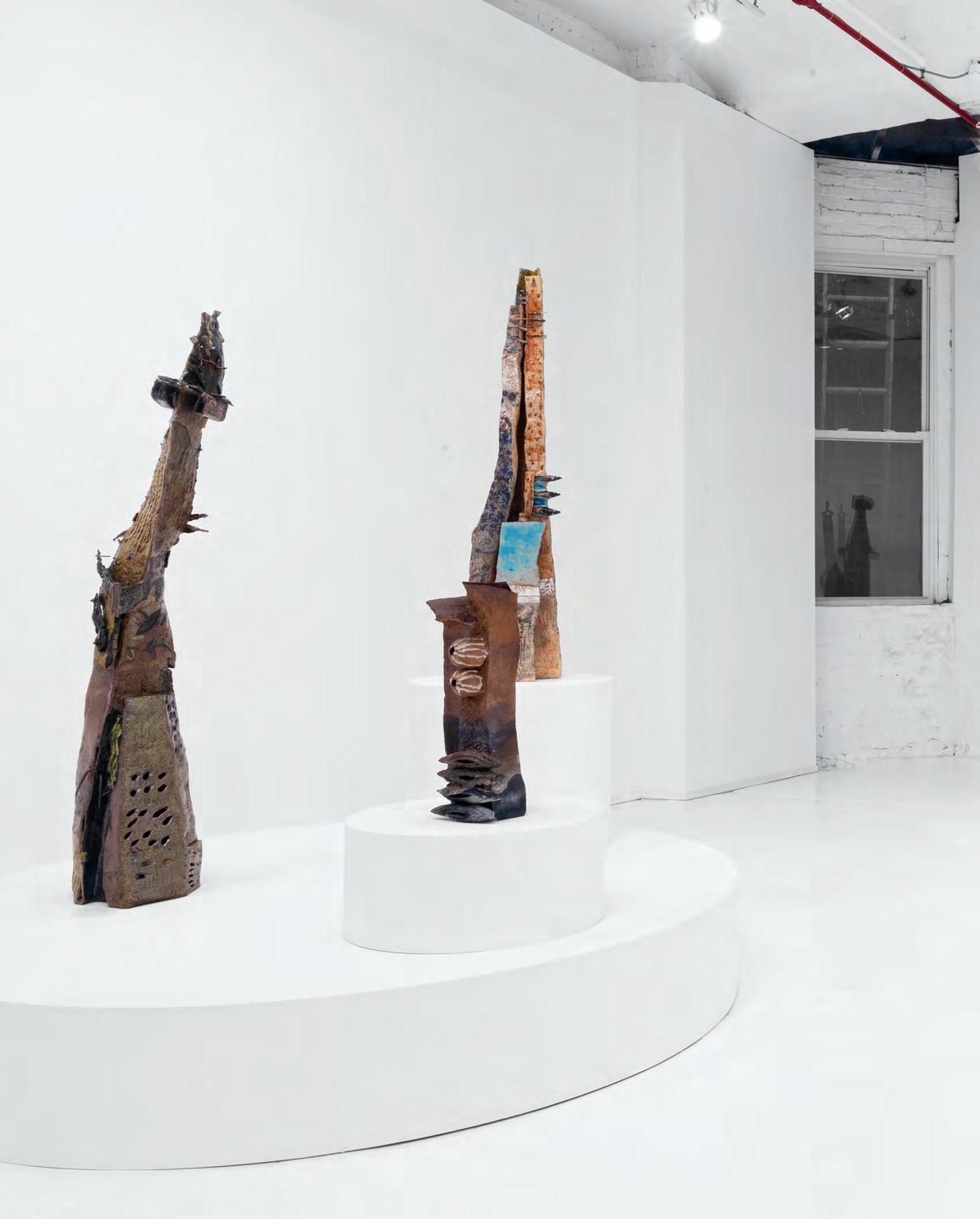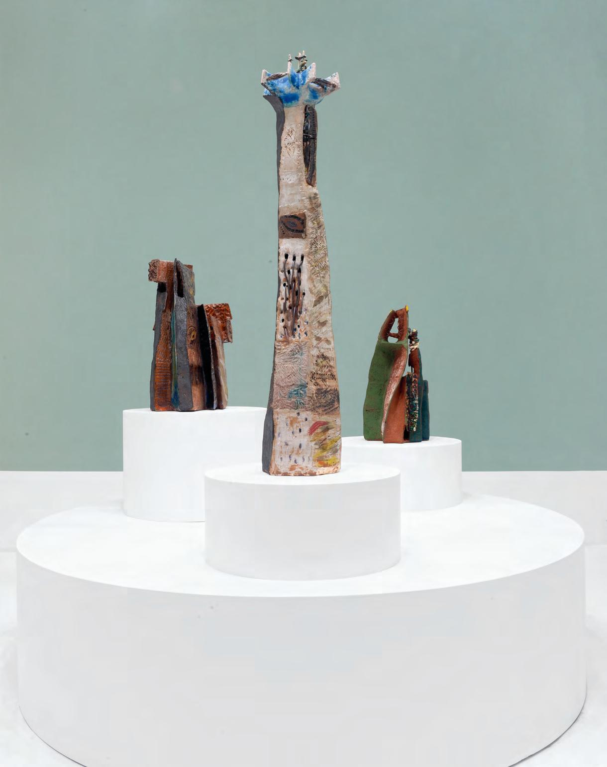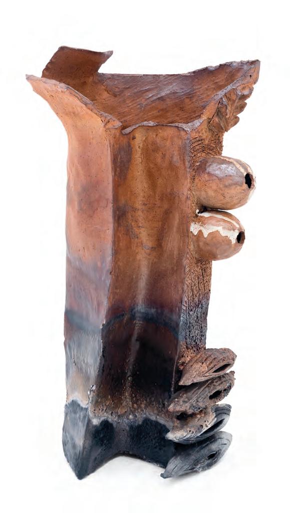 On a bright, hot August day I took the LIRR to Jamaica Center and Ubered to St. Albans, a storied African American community in Southwestern Queens. Queens has boulevards wider than the ones in Paris, and St. Albans has some show piece houses next to more modest dwellings. All have that house proud stamp— pretty gardens, trimmed lawns, portals that announce, “you have arrived.” Then I get to the home of Sana Musasama and her red brick front home where the yard announces a di erent way to garden, one not so trim, not so pretty, not so tidy. Not at all. This modest structure is clearly the home of an artist, and with that it has the challenges and charms that a childhood home, now artist’s studio, contains. In this building, there is groundedness and unease, similar to the tilts of some of her stoneware sculptures with their nods to the precarity of shelter. How di cult it can be to achieve it, how so very easily it can go.