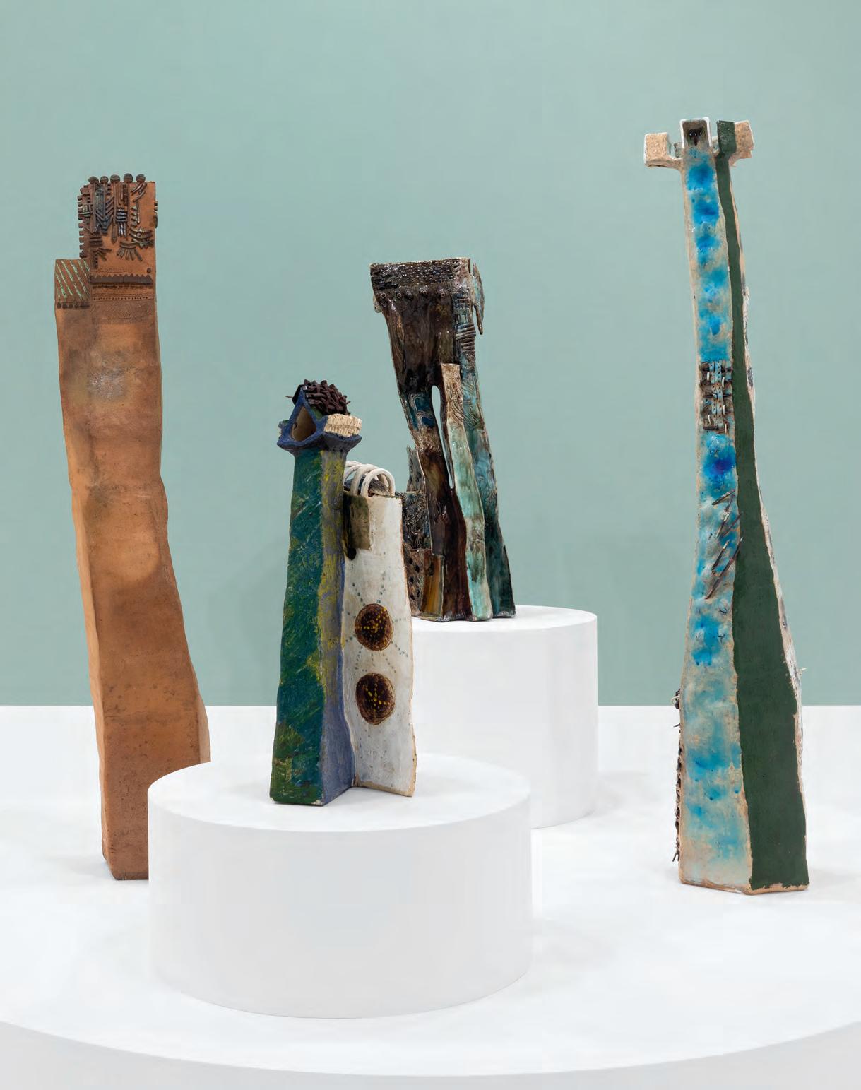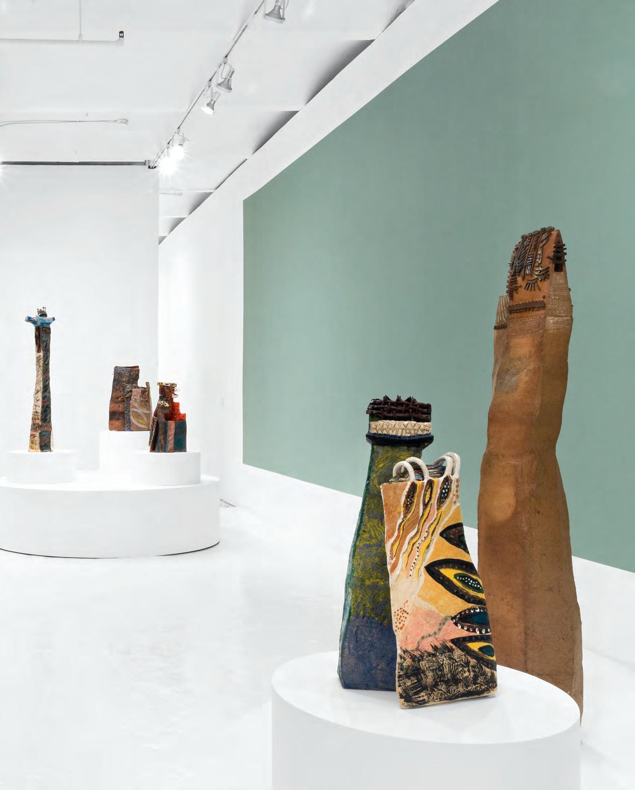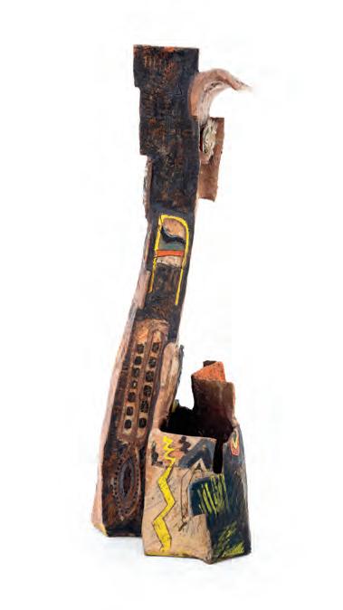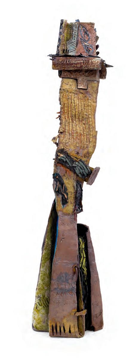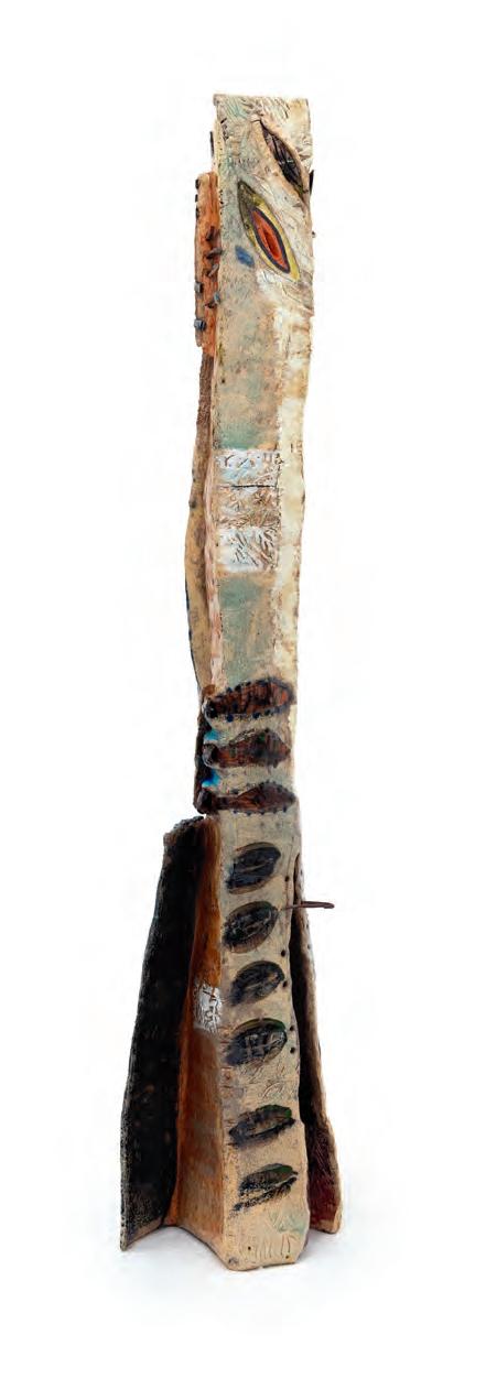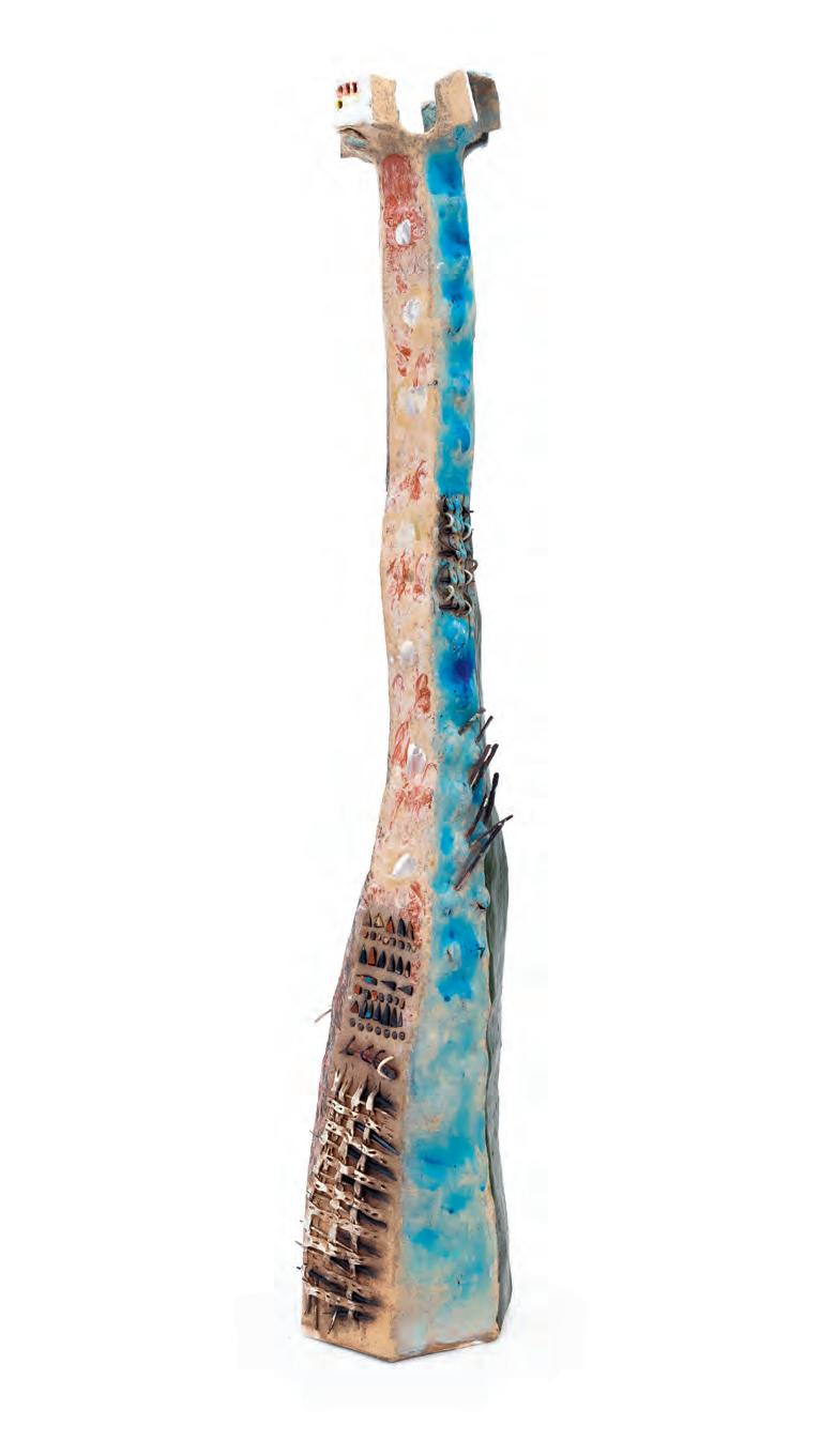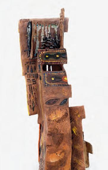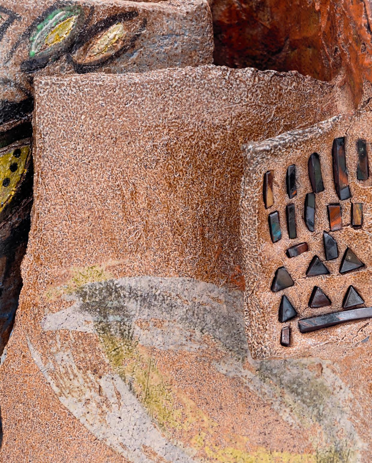 On a bright, hot August day I took the LIRR to Jamaica Center and Ubered to St. Albans, a storied African American community in Southwestern Queens. Queens has boulevards wider than the ones in Paris, and St. Albans has some show piece houses next to more modest dwellings. All have that house proud stamp— pretty gardens, trimmed lawns, portals that announce, “you have arrived.” Then I get to the home of Sana Musasama and her red brick front home where the yard announces a di erent way to garden, one not so trim, not so pretty, not so tidy. Not at all. This modest structure is clearly the home of an artist, and with that it has the challenges and charms that a childhood home, now artist’s studio, contains. In this building, there is groundedness and unease, similar to the tilts of some of her stoneware sculptures with their nods to the precarity of shelter. How di cult it can be to achieve it, how so very easily it can go.