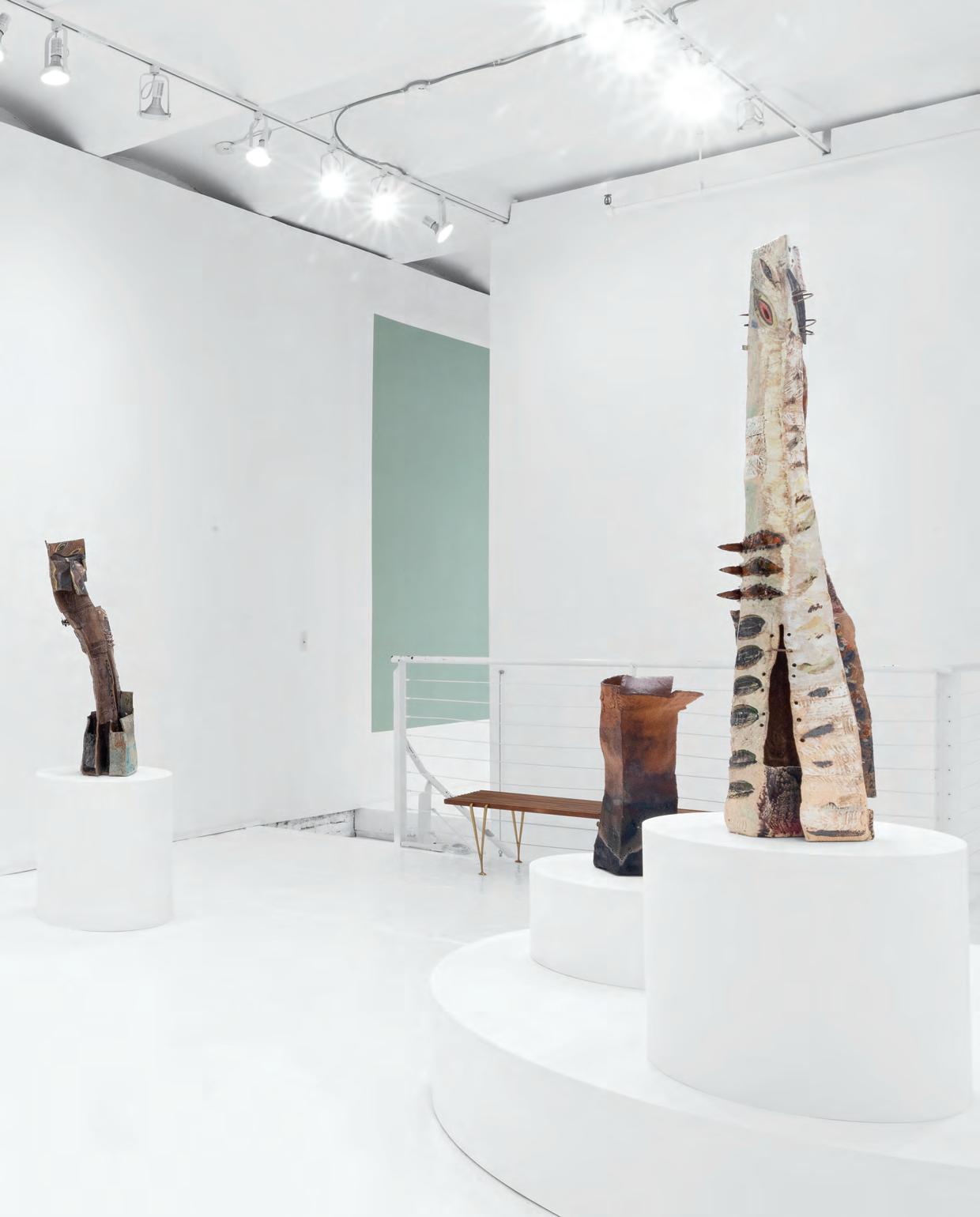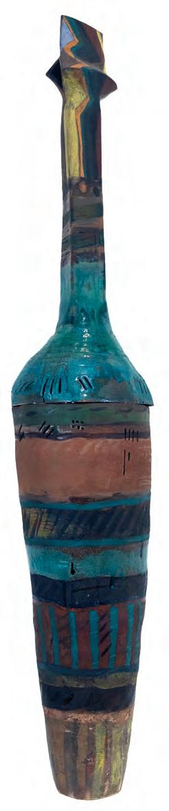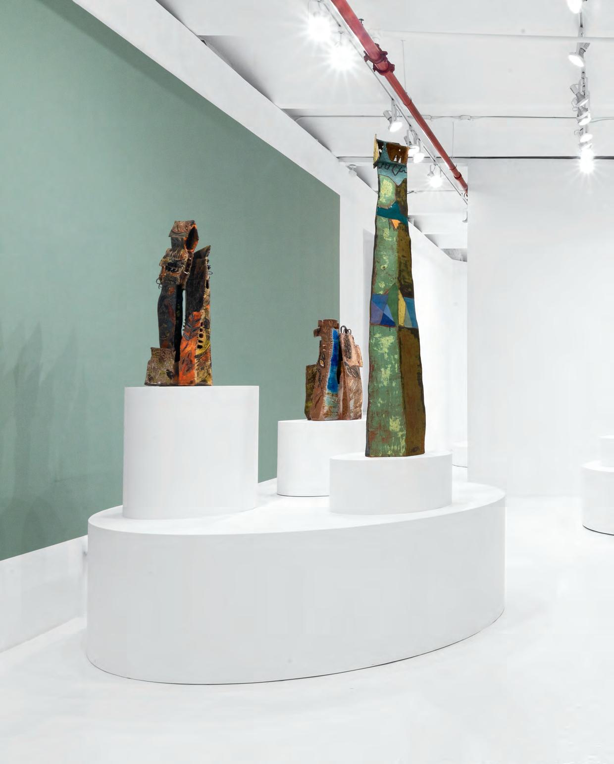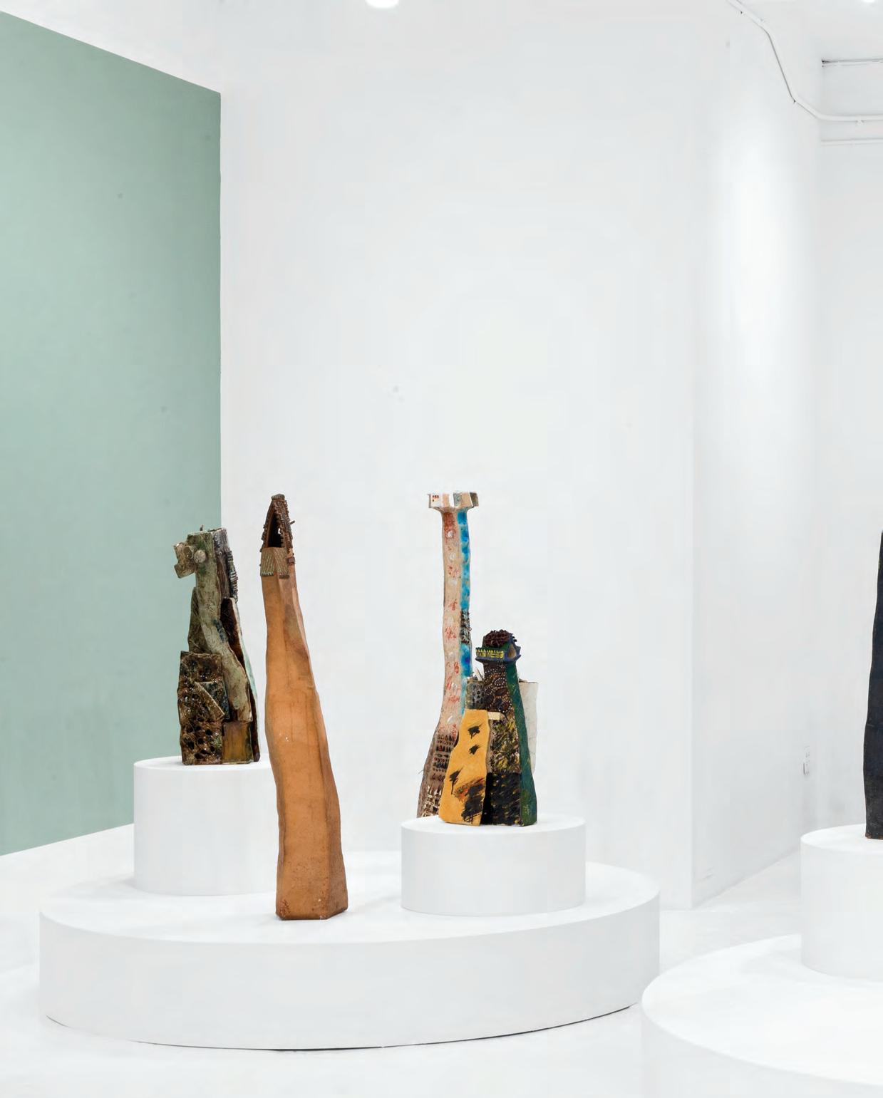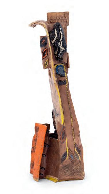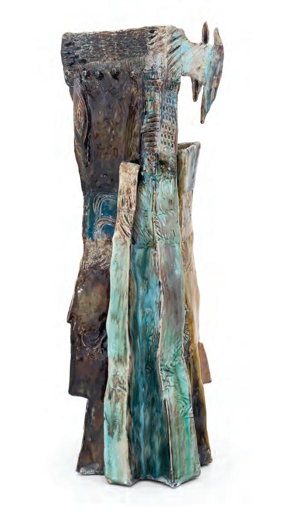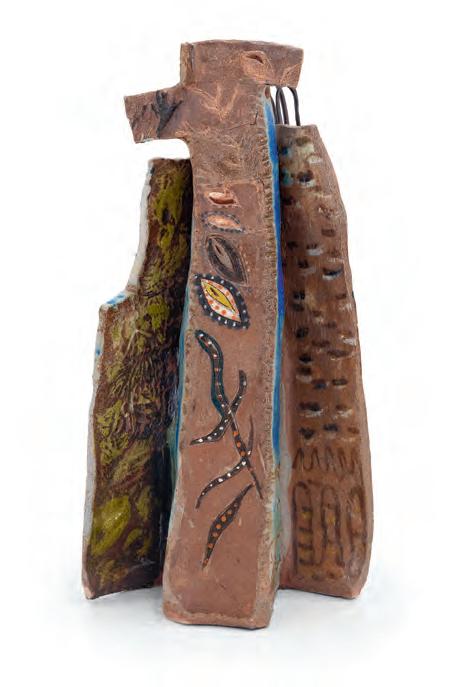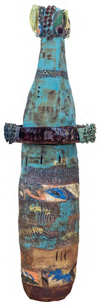 On a bright, hot August day I took the LIRR to Jamaica Center and Ubered to St. Albans, a storied African American community in Southwestern Queens. Queens has boulevards wider than the ones in Paris, and St. Albans has some show piece houses next to more modest dwellings. All have that house proud stamp— pretty gardens, trimmed lawns, portals that announce, “you have arrived.” Then I get to the home of Sana Musasama and her red brick front home where the yard announces a di erent way to garden, one not so trim, not so pretty, not so tidy. Not at all. This modest structure is clearly the home of an artist, and with that it has the challenges and charms that a childhood home, now artist’s studio, contains. In this building, there is groundedness and unease, similar to the tilts of some of her stoneware sculptures with their nods to the precarity of shelter. How di cult it can be to achieve it, how so very easily it can go.