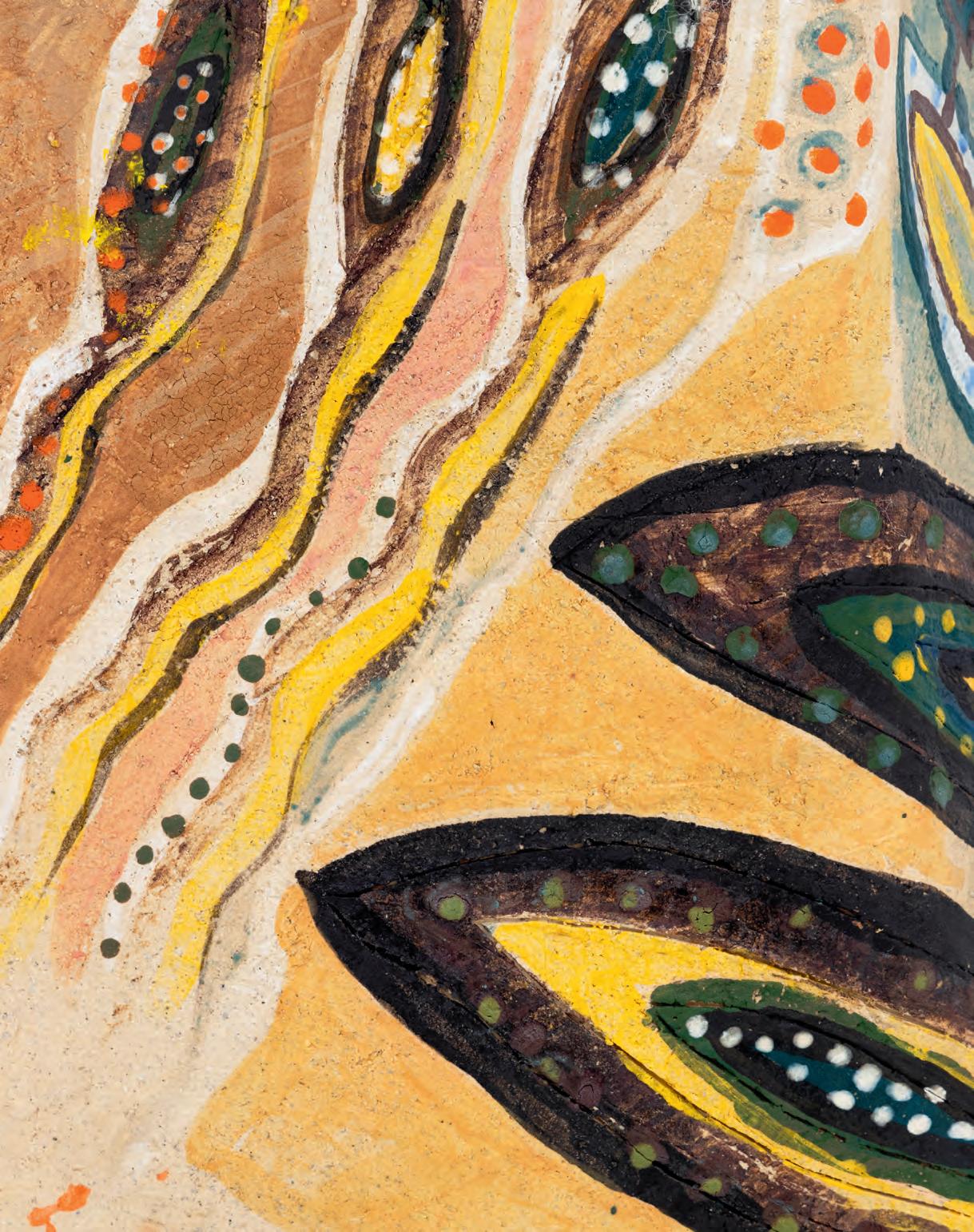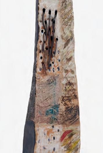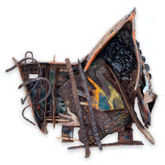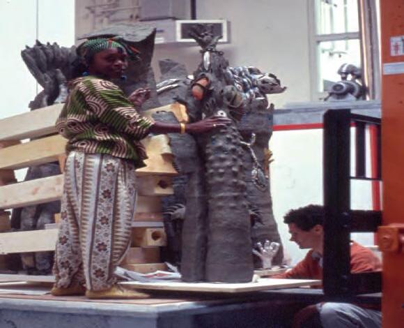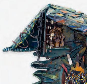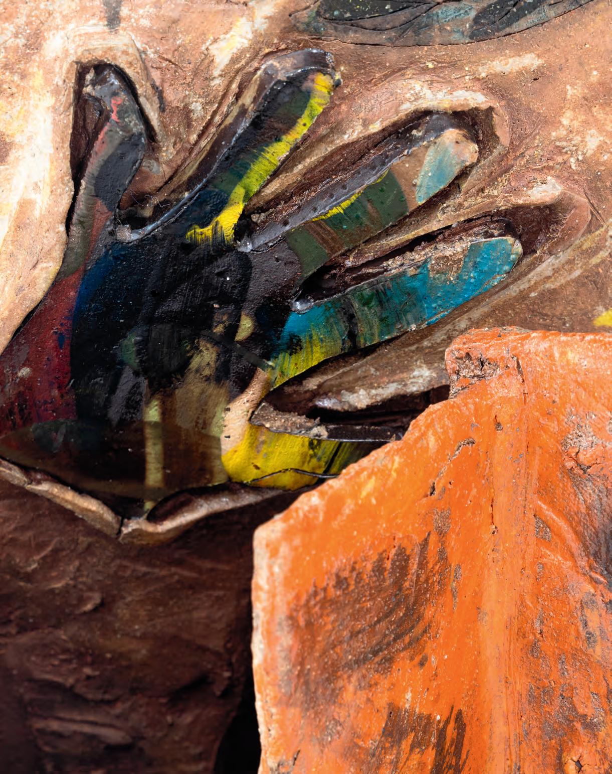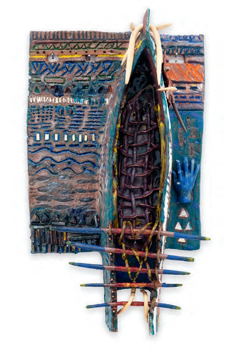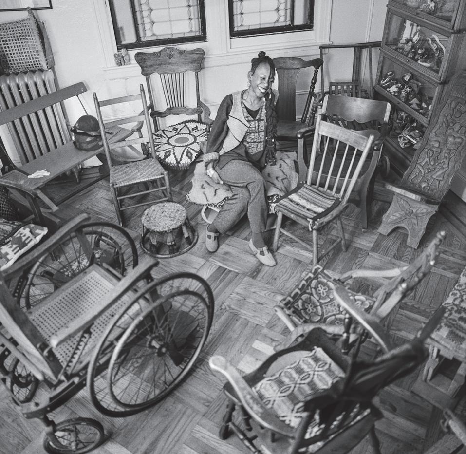 On a bright, hot August day I took the LIRR to Jamaica Center and Ubered to St. Albans, a storied African American community in Southwestern Queens. Queens has boulevards wider than the ones in Paris, and St. Albans has some show piece houses next to more modest dwellings. All have that house proud stamp— pretty gardens, trimmed lawns, portals that announce, “you have arrived.” Then I get to the home of Sana Musasama and her red brick front home where the yard announces a di erent way to garden, one not so trim, not so pretty, not so tidy. Not at all. This modest structure is clearly the home of an artist, and with that it has the challenges and charms that a childhood home, now artist’s studio, contains. In this building, there is groundedness and unease, similar to the tilts of some of her stoneware sculptures with their nods to the precarity of shelter. How di cult it can be to achieve it, how so very easily it can go.