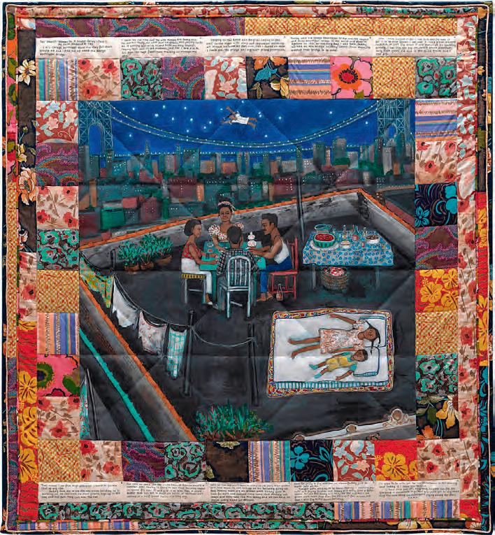 Faith Ringgold, Woman on a Bridge #1 of 5: Tar Beach, 1988, acrylic paint, canvas, printed fabric, ink, and thread, 74 5/8 ✕ 68 1/2 in. Solomon R. Guggenheim Museum. New York Gift, Mr. and Mrs. Gus and Judith Leiber, 1988. © 2025 Anyone Can Fly Foundation / Artists Rights Society (ARS), New York.