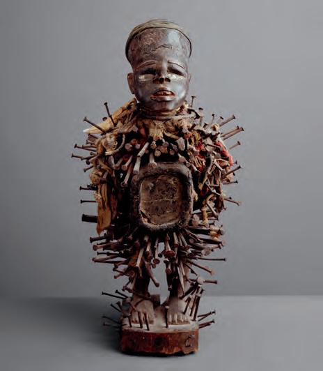 Kongo sculptor and nganga , Power Figure (Nkisi N’kondi), 19th–early 20th century, wood with iron, cloth, mirror, leopard tooth, fiber, and porcelain, 18 × 8 × 3 1/2 in. Yale University Art Gallery, New Haven. Charles B. Benenson, B.A. 1933, Collection.