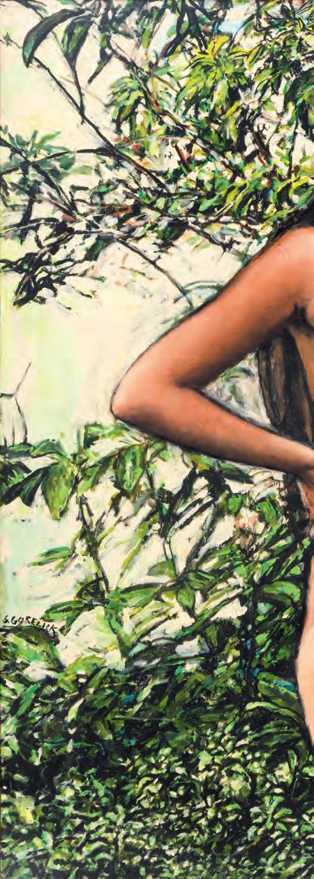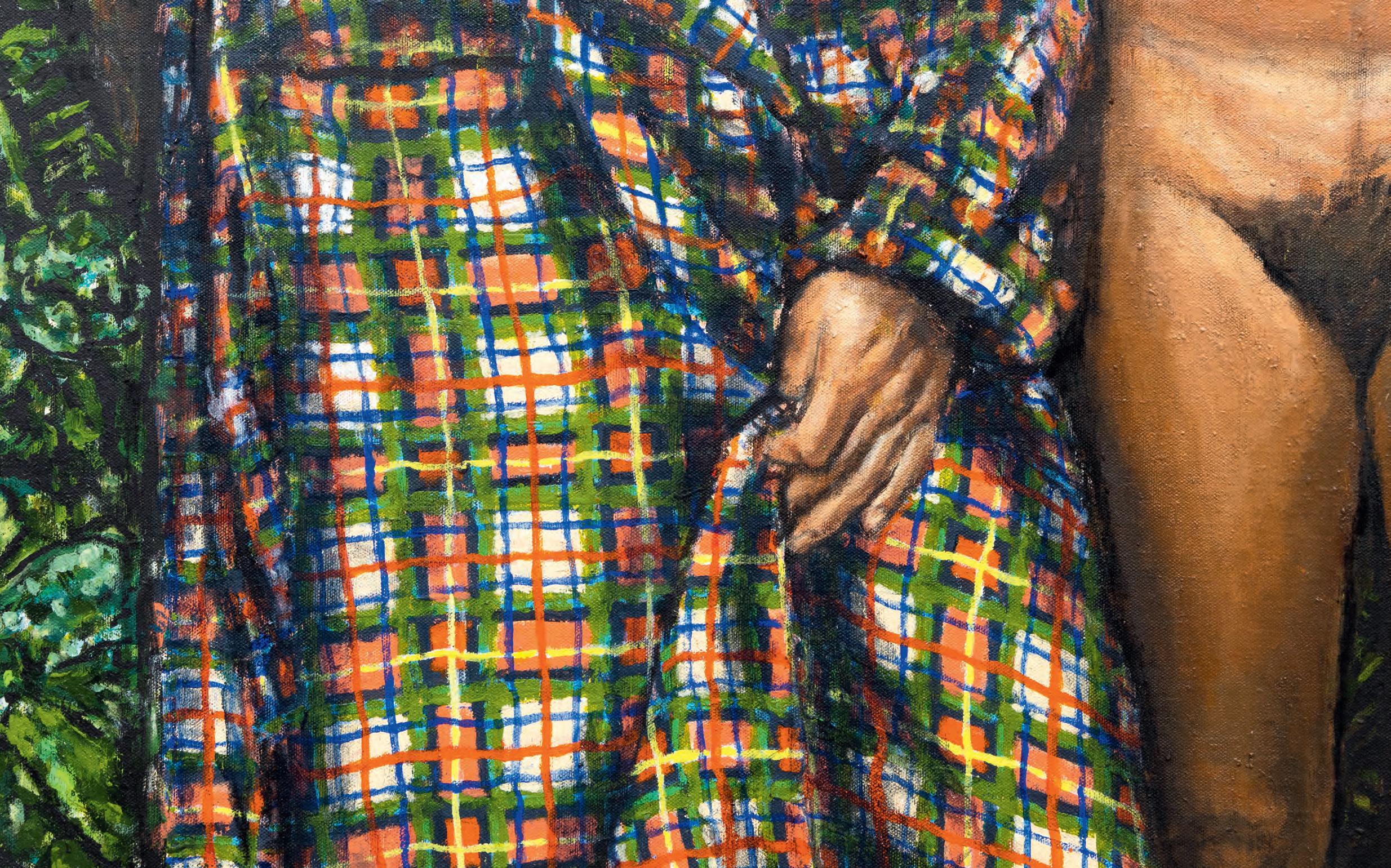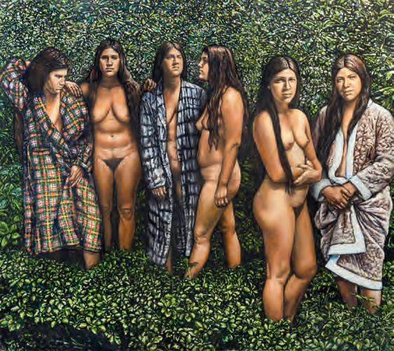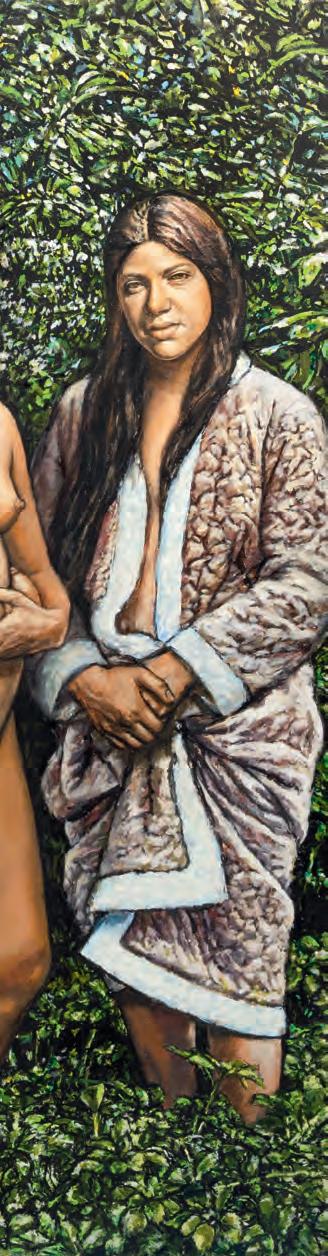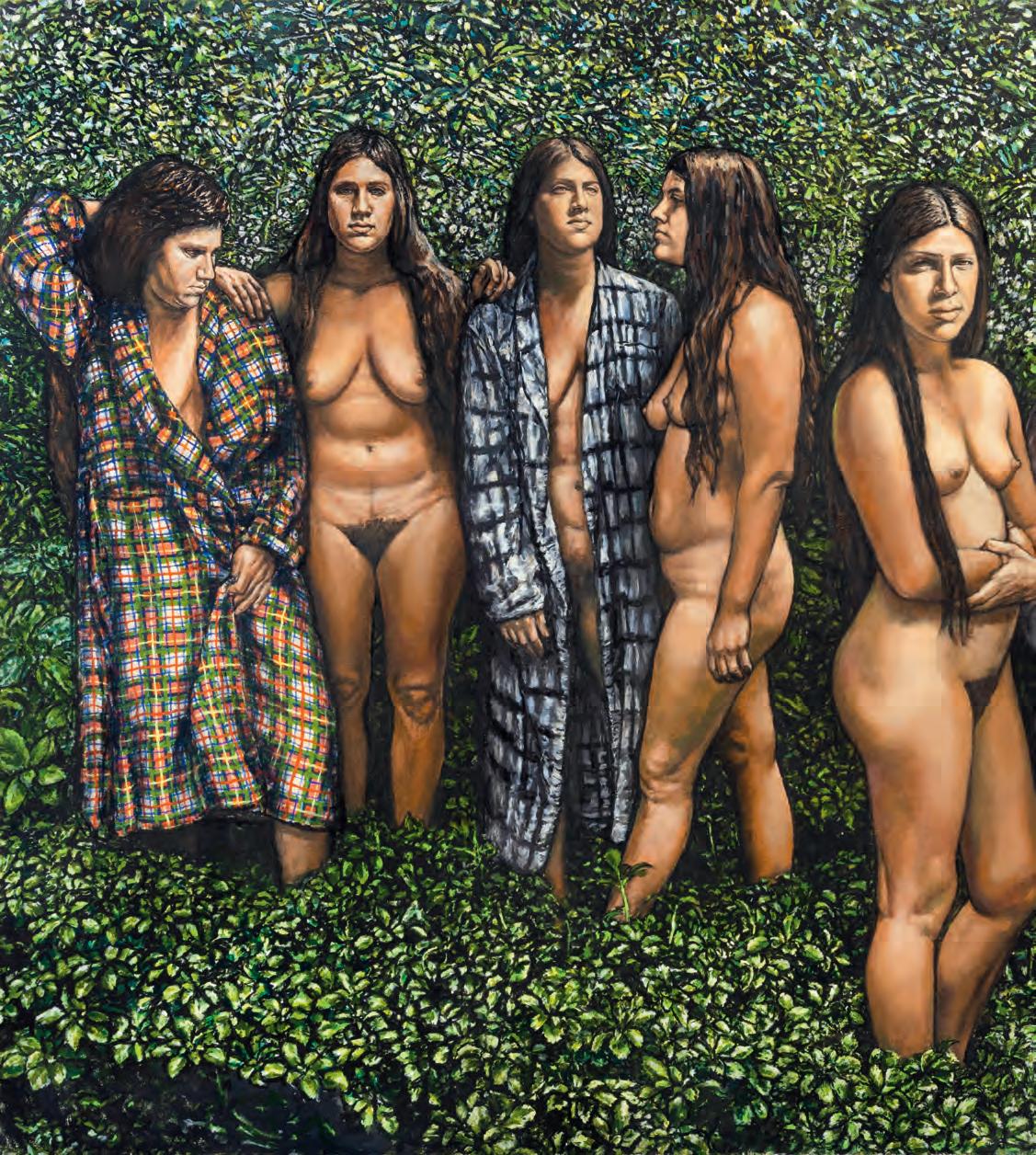 is a tremendous curtain of foliage in the background in which every single leaf is delicately articulated. The sisters slouch and smirk among the greenery in various states of undress, their bemused poses a wry wink at Gauguin’s passive Tahitian sirens.