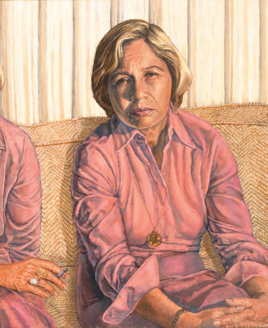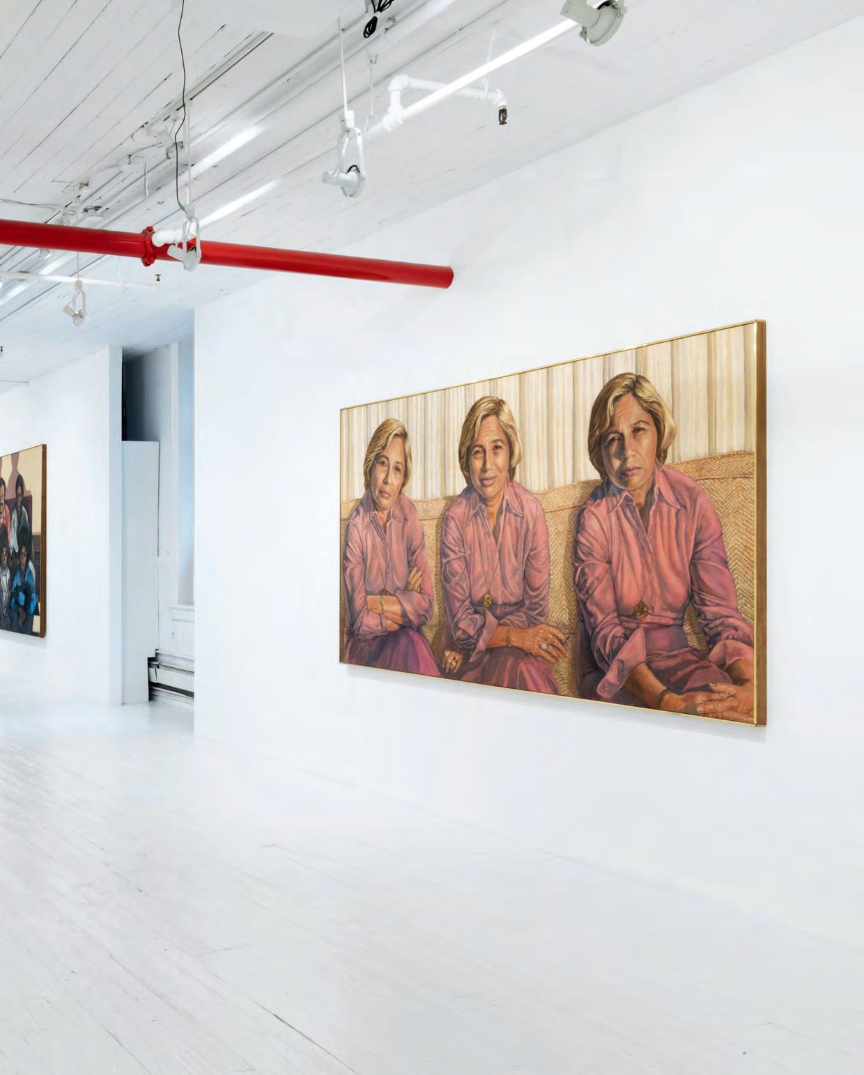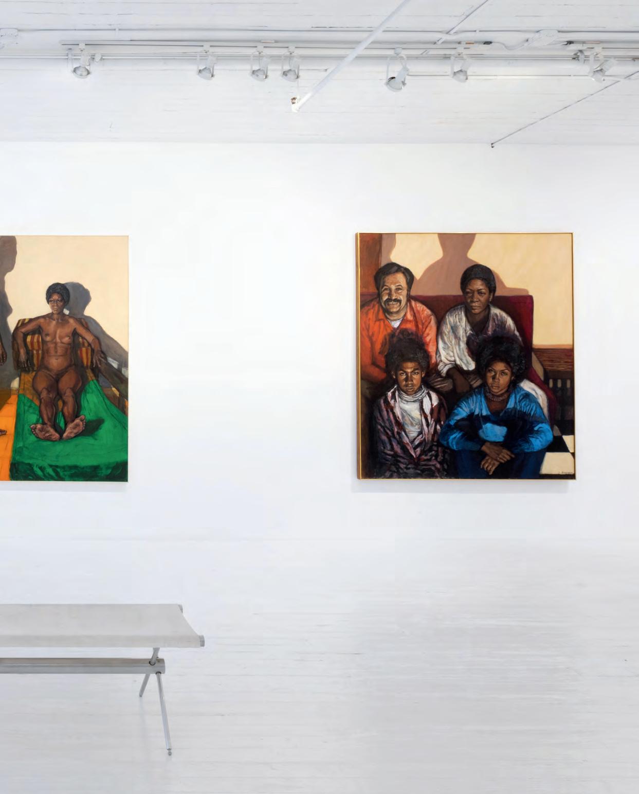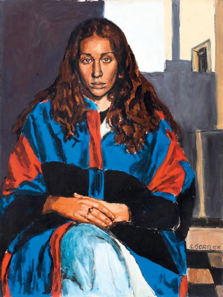straightforward yet painterly approach to realism. Realism was (and often still is) dismissed by some critics as overly academic, void of artistic gesture. But for Gorelick, who was a formalist first and foremost, realism provided inexhaustible opportunities to play with shadow and pattern. And, importantly, paint. Gorelick wielded acrylic paint like oil, experimenting with thicker or thinner applications, and exploiting its plasticity. Several of the paintings in “Family” feature exquisitely layered backgrounds. The 1980 painting, Tess in a Blue Dress (pl. 5), places Dr. Forrest in front of a bookcase crowded with books and sculptures. The creases in the brown leather armchair, the fabric of the teal blue dress, and Forrest’s gold jewelry are rendered in rich detail. Similarly, in Three Sisters II (Westchester Gauguin) (pl. 8), from 1974–76, there