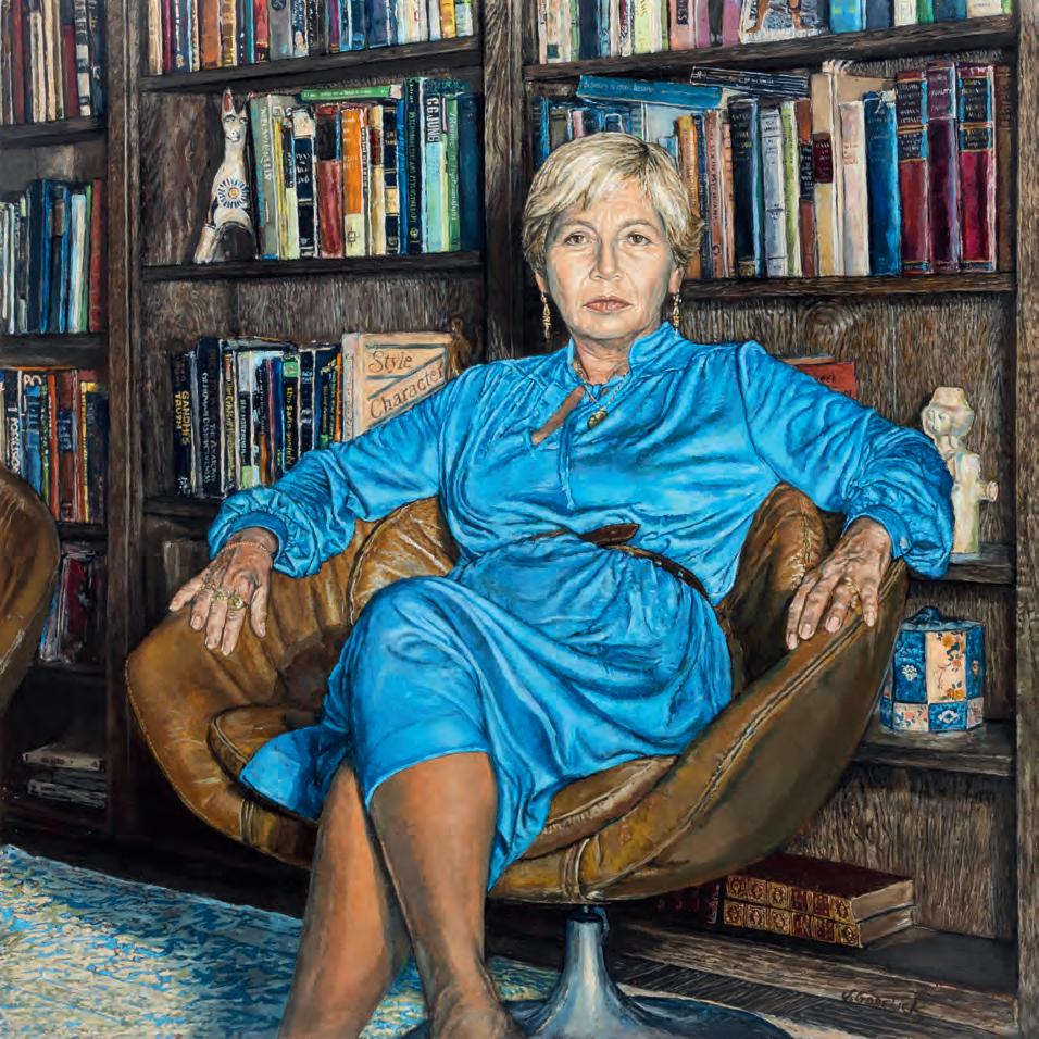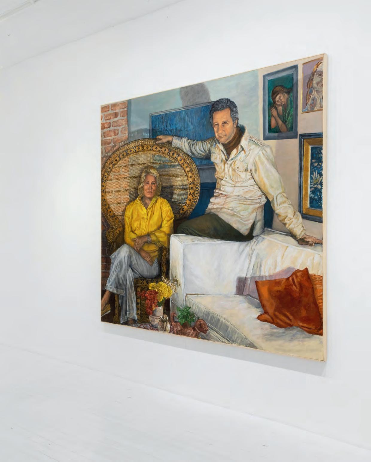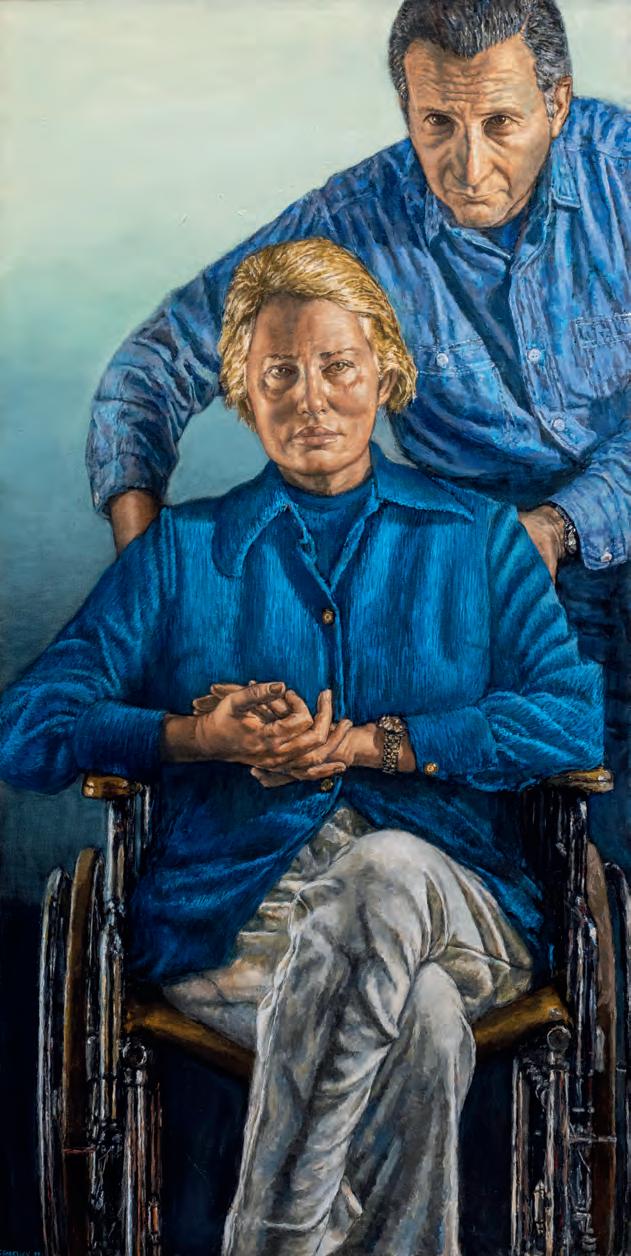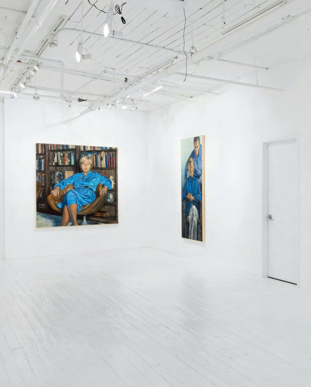 straightforward yet painterly approach to realism. Realism was (and often still is) dismissed by some critics as overly academic, void of artistic gesture. But for Gorelick, who was a formalist first and foremost, realism provided inexhaustible opportunities to play with shadow and pattern. And, importantly, paint. Gorelick wielded acrylic paint like oil, experimenting with thicker or thinner applications, and exploiting its plasticity. Several of the paintings in “Family” feature exquisitely layered backgrounds. The 1980 painting, Tess in a Blue Dress (pl. 5), places Dr. Forrest in front of a bookcase crowded with books and sculptures. The creases in the brown leather armchair, the fabric of the teal blue dress, and Forrest’s gold jewelry are rendered in rich detail. Similarly, in Three Sisters II (Westchester Gauguin) (pl. 8), from 1974–76, there