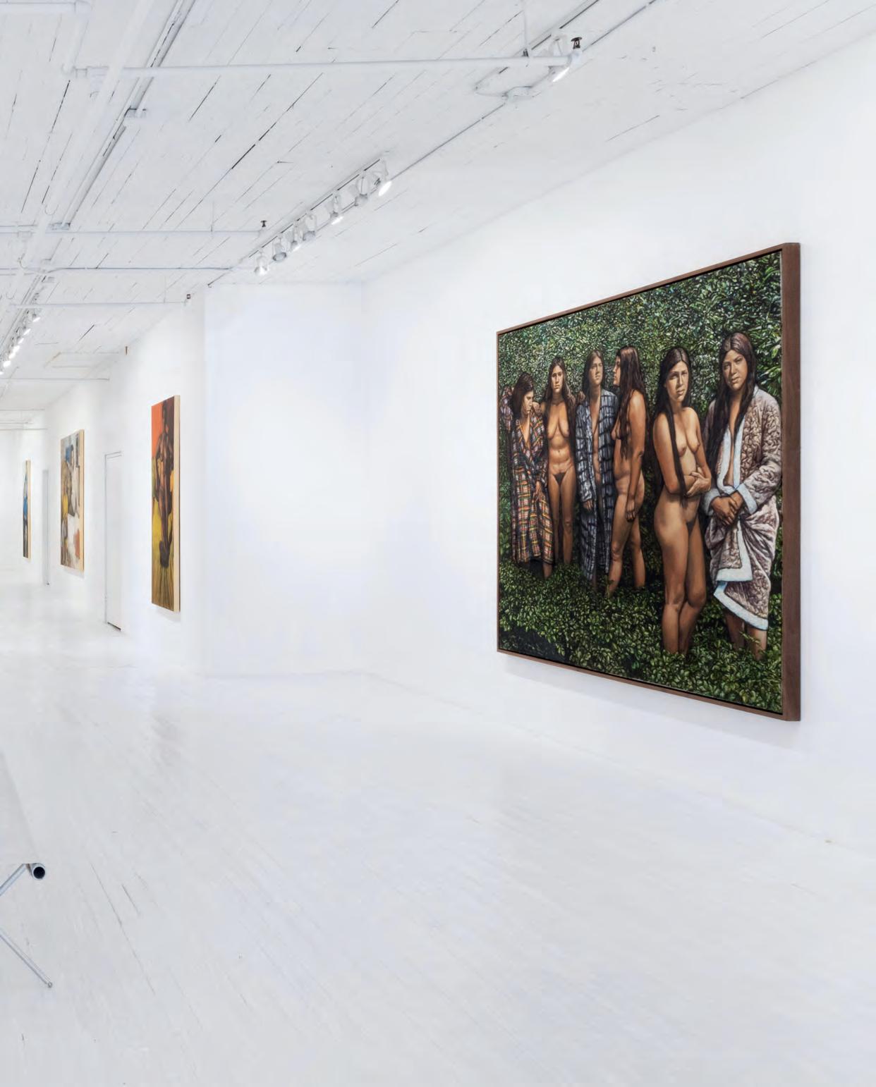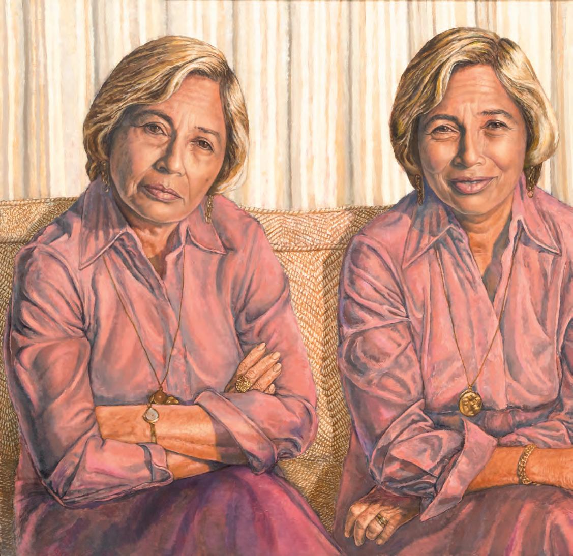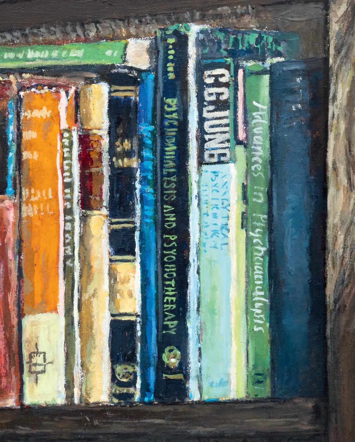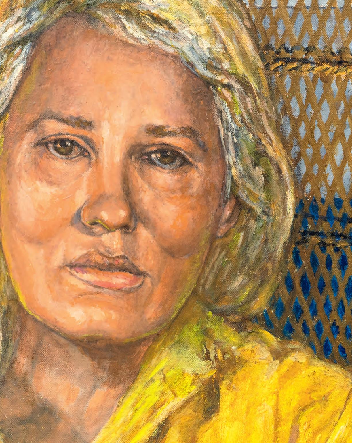 straightforward yet painterly approach to realism. Realism was (and often still is) dismissed by some critics as overly academic, void of artistic gesture. But for Gorelick, who was a formalist first and foremost, realism provided inexhaustible opportunities to play with shadow and pattern. And, importantly, paint. Gorelick wielded acrylic paint like oil, experimenting with thicker or thinner applications, and exploiting its plasticity. Several of the paintings in “Family” feature exquisitely layered backgrounds. The 1980 painting, Tess in a Blue Dress (pl. 5), places Dr. Forrest in front of a bookcase crowded with books and sculptures. The creases in the brown leather armchair, the fabric of the teal blue dress, and Forrest’s gold jewelry are rendered in rich detail. Similarly, in Three Sisters II (Westchester Gauguin) (pl. 8), from 1974–76, there