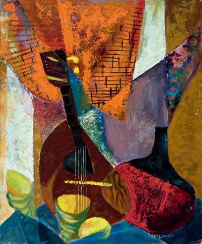 Shirley Gorelick, Untitled (still life with guitar and vase), c. 1947–50, oil on canvas board, 23 7/8 × 19 7/8 inches
