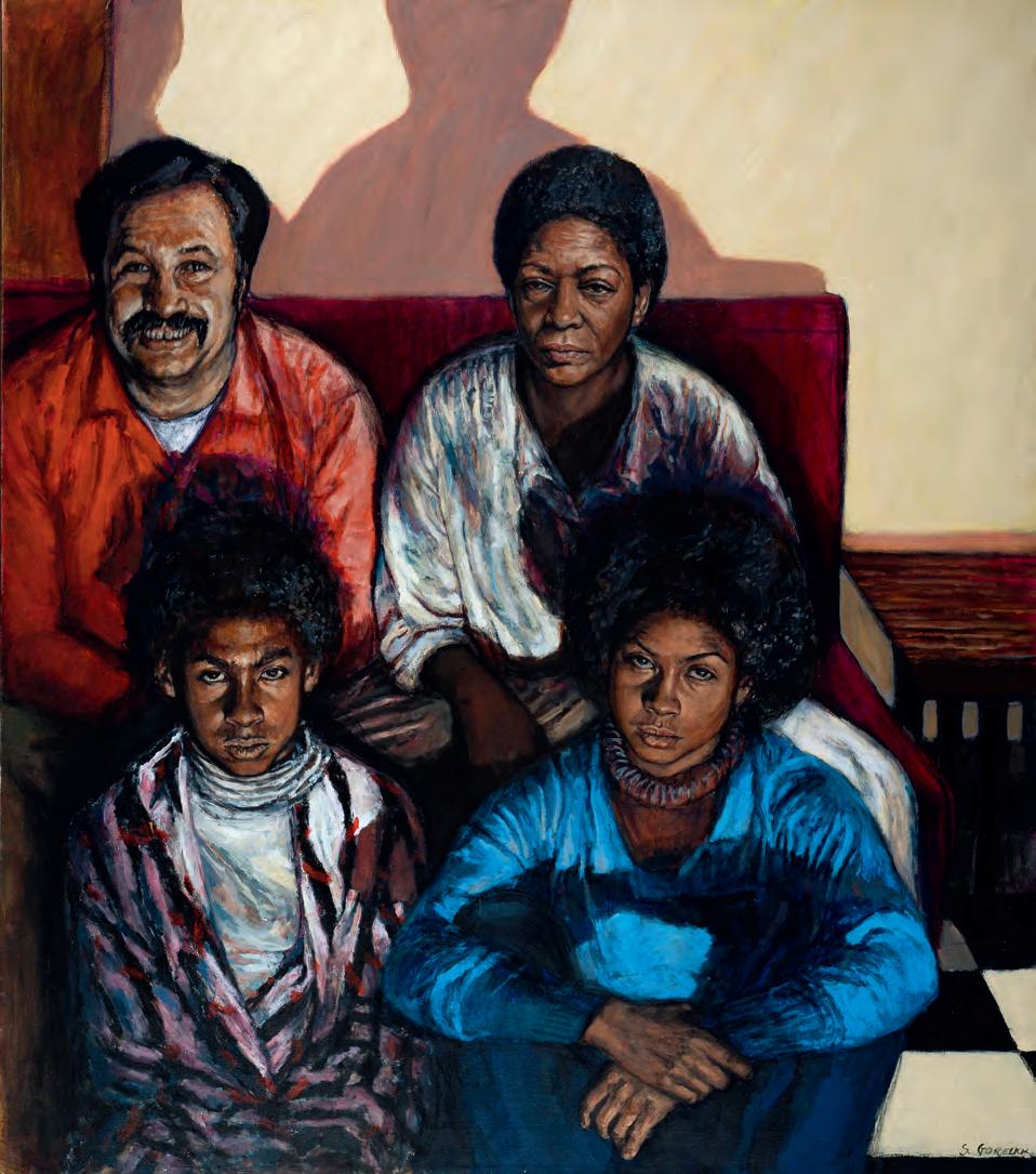 Gorelick’s 1973 painting, Family II (pl. 2), portrays Libby with her white Jewish husband and their two biracial children. The parents are seated on a bench behind the children, who are seated on the floor. The father alone is smiling, grinning, in fact. Libby looks calm and perhaps a bit tired, while her son and daughter, both wearing afros, look mildly annoyed at having