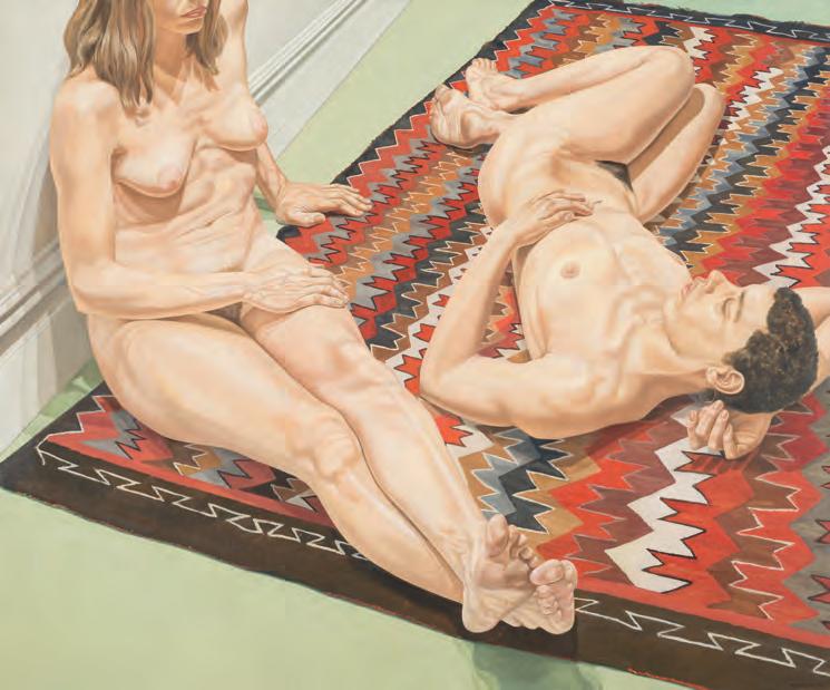 Philip Pearlstein, Two Female Models Sitting and Lying on a Navajo Rug, 1972, oil on canvas, 60 × 72 inches, Purchased with funds from the Coffin Fine Arts Trust; Nathan Emory Coffin Collection of the Des Moines Art Center, 1972.86. Photo Credit: Rich Sanders, Des Moines. © 2024 Estate of Philip Pearlstein / Artists Rights Society (ARS), New York