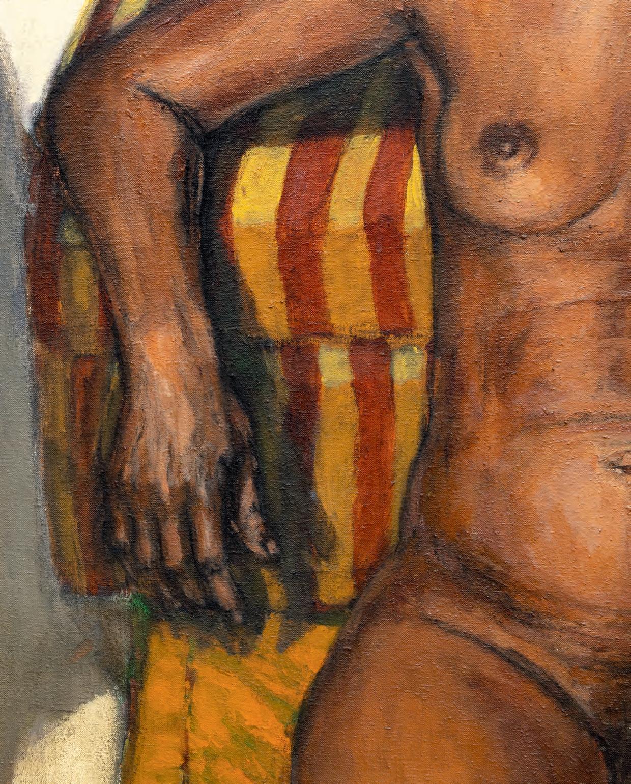 What sort of “monument weight” did Gorelick have in mind? The scale of the paintings is larger than life, ensuring that viewers feel almost as though the figures are towering over them. Yet the notion of “monument” here does not seem to apply to size. Instead, the people being portrayed—while not famous—are powerfully arresting. Gorelick’s figures look directly at the viewer with confidence, if not outright defiance, as though daring someone to challenge their right to exist. And given the period in which Gorelick was