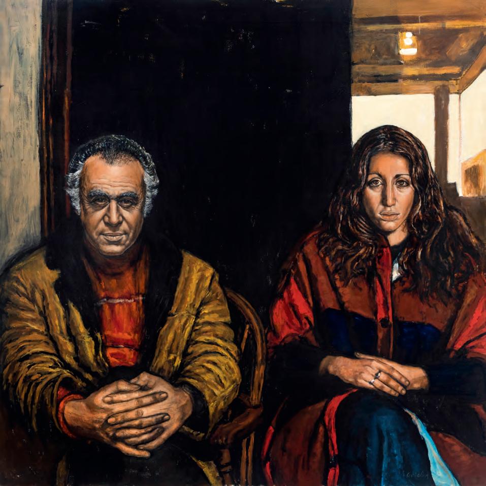 to sit for a portrait. The shadows are stark. The outlines of the two adults are crisply projected against the white wall in the background, while the face of the daughter, in particular, is dramatically composed from dark shades and lighter hues, her brow casting a dark triangle under one eye. The family is seated close together, as though forming a protective unit against any biases they might face.