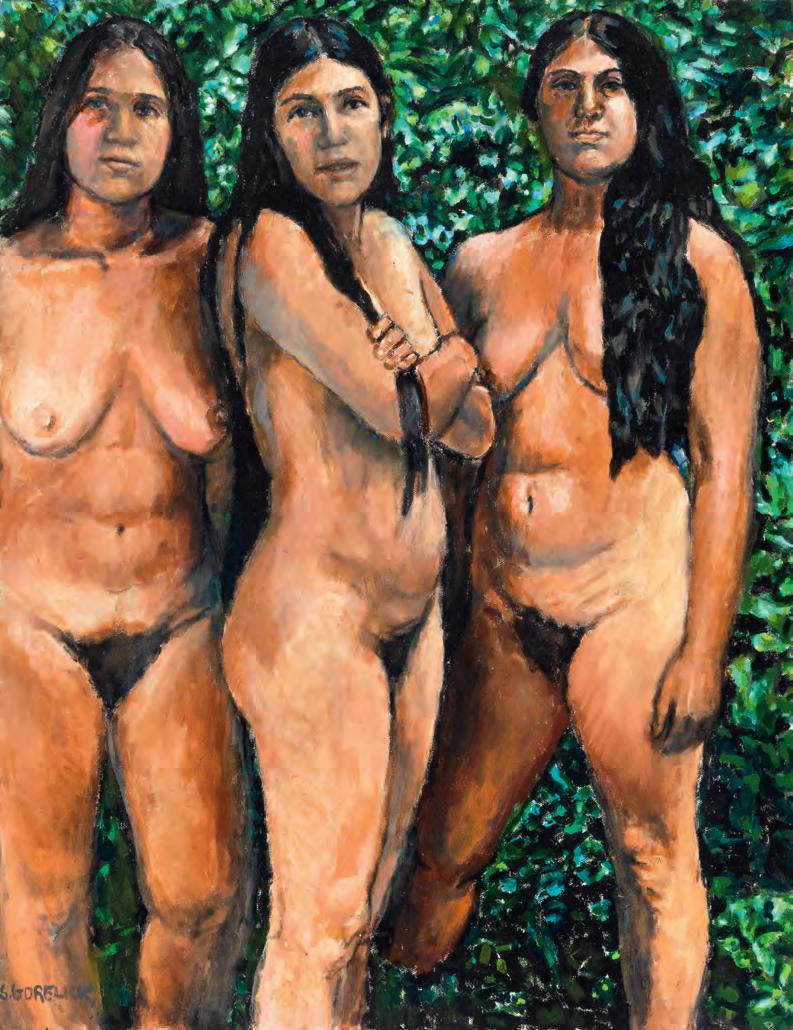 Shirley Gorelick, Three Sisters II (Westchester Gauguin), 1974–76, acrylic on canvas, 90 × 80 inches