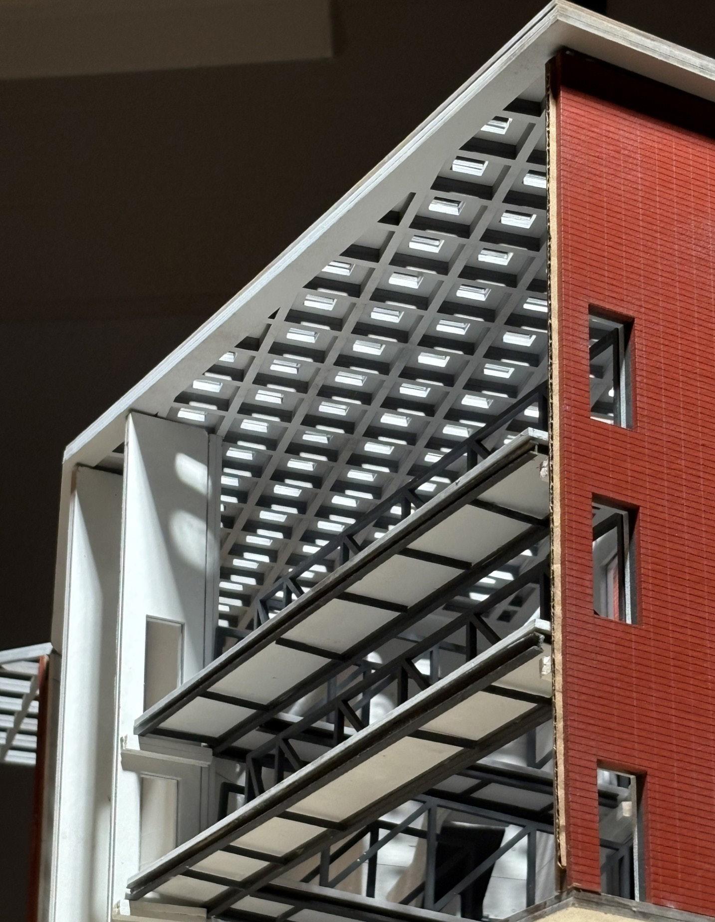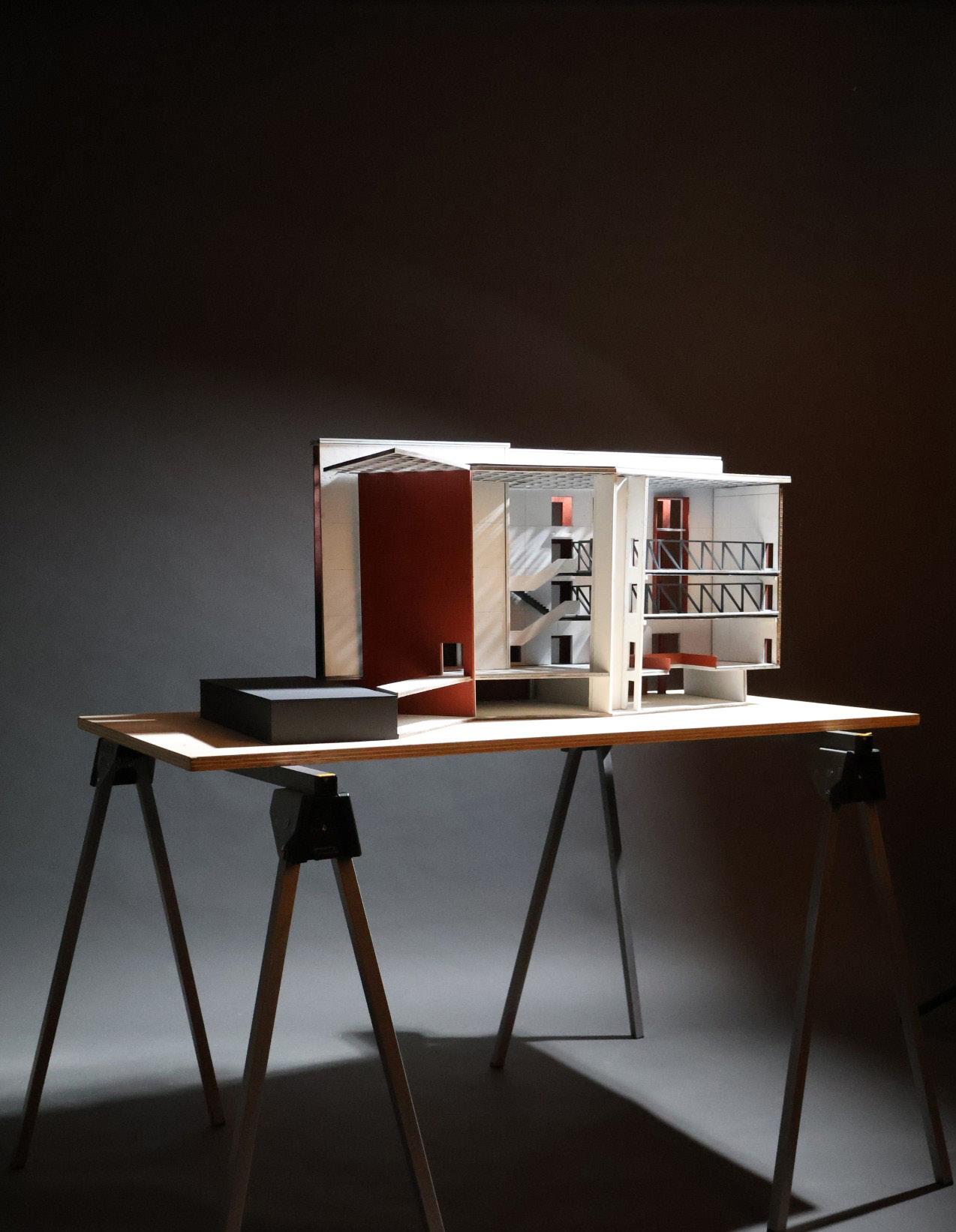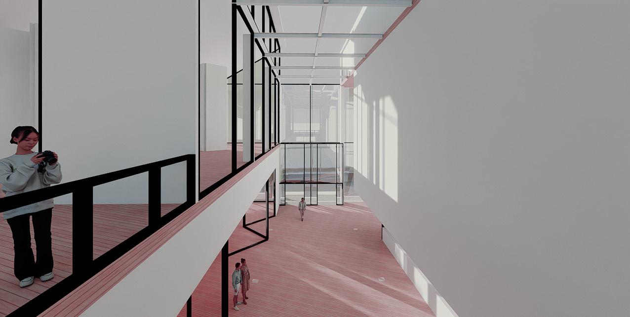 Inspired by Lowell and its historic canal system, the project reflects the city’s legacy of industrial infrastructure, suspension, and flow. The existing masonry structure, once spatially restrictive, now houses enclosed functions like classrooms and offices. In contrast, a reinforced concrete addition creates large, open spans connected by bridges, promoting movement, collaboration, and visual connectivity.