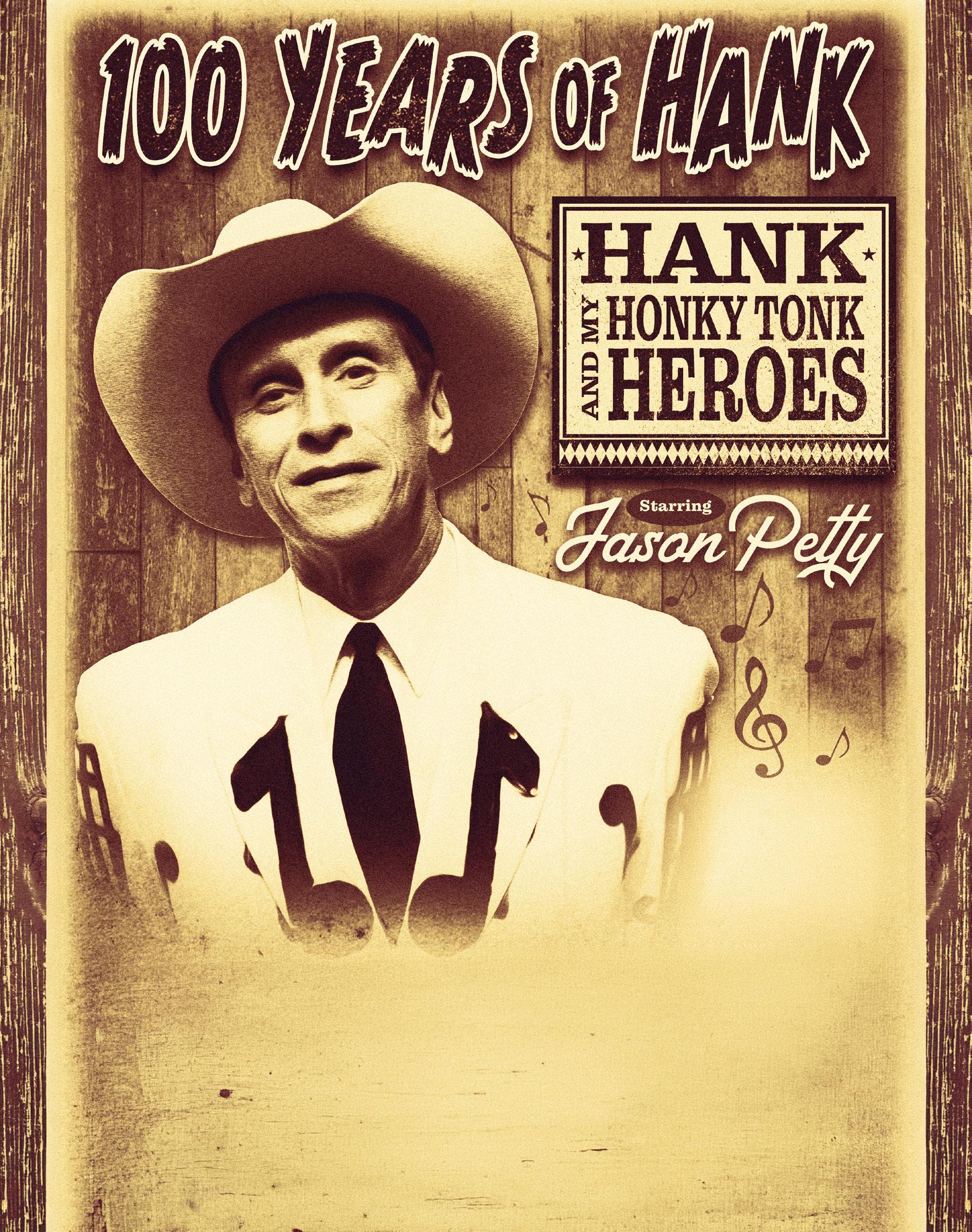 Jason Petty celebrates Hank Williams 100th birthday with his critically acclaimed tribute, Hank and My Honky Tonk Heroes. Williams penned over 400 country songs depicting the trials and tribulations of the common man and woman. Among his timeless classics are Hey Good Lookin’, Your Cheatin’ Heart, I’m So Lonesome I Could Cry, Jambalaya and I Saw The Light. Williams is credited with creating the style that would influence other artists such as Patsy Cline, George Jones, Merle Haggard and Elvis Presley. He is considered the single most influential person in country music history and is enshrined in the Country Music Hall of Fame, the Songwriters Hall of Fame and the Rock and Roll Hall of Fame. Jason Petty gained national notoriety when he portrayed Hank Williams in the biographical/musical about Williams’ life titled Hank Williams: Lost Highway. Petty first portrayed the country legend on the world-famous Ryman Auditorium stage in Nashville, TN, for a 2-year run of the Williams’ production. After 2 national tours, he landed in New York City where he won the Obie Award for Best Actor in the Off-Broadway production of Hank Williams: Lost Highway.