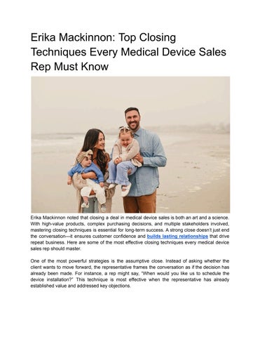 Erika Mackinnon has built a steady and focused career in medical sales over the past five years. She has demonstrated a well-rounded skill set with experience in business development, strategic planning, revenue maximization, market research, analysis, sales forecasting, new product presentations, account management, and maintaining client relationships. Since 2020, she has worked in medical device sales, particularly on Spine. As a Spine Specialist and Sales Associate, she is involved in daily operating room procedures, supporting healthcare teams with specialized products and insights. Her entry into medical sales began with completing a demanding 440-hour postgraduate course at Medical Sales College in Sarasota, Florida. This program awarded her a Spine, Orthopedic Reconstruction, and Trauma certification. Erika gained foundational skills in regenerative medicine, consultative sales techniques, orthopedic and spine devices, and strategic approaches to growing territories and expanding customer bases. Mackinnon developed a detailed understanding of procedures and products related to spine, biologics, orthopedic reconstruction, sports medicine, and trauma. Alongside product knowledge, she became proficient in medical communication, anatomy, physiology, pathology, biomechanics, ortho biologics, and terminology. She also trained in hospital call points and operating room procedures, strengthening her ability to meet provider needs and articulate product advantages effectively. During her training, Erika joined SS Fusion Medica in Tampa, Florida, as a Sales Associate. There, she supported account coverage, set up meetings with physicians and medical staff, and built strong working relationships within her assigned territories.