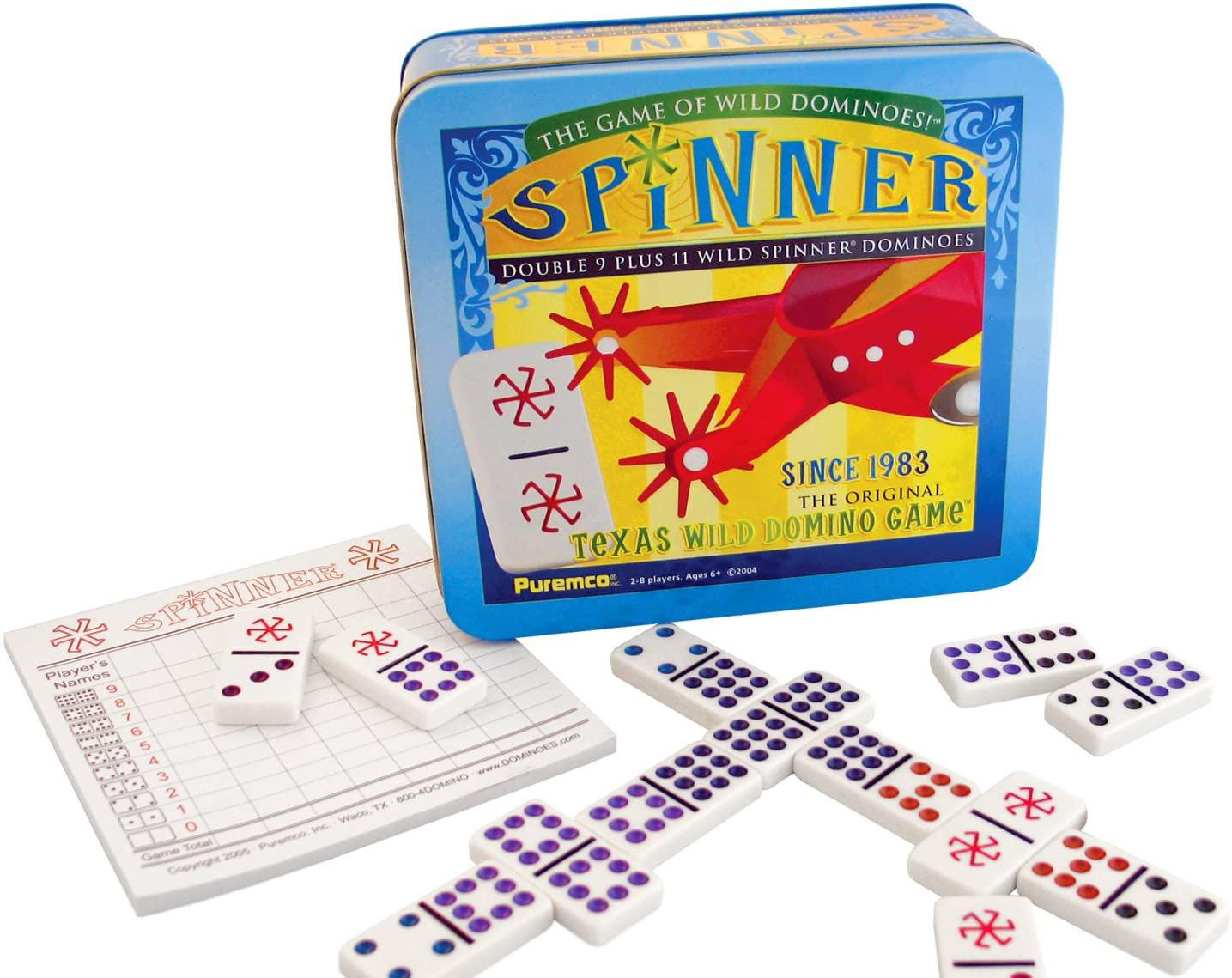 Spinner, original Texas wild domino game, is a fantastic, fun combination of the world’s best domino games. Spinner is the only domino game with wild dominoes that can be played as any number. The beautiful wooden box contains 55 standard size dominoes with colored dots, 11 extra Spinner dominoes and a Spinner score pad.