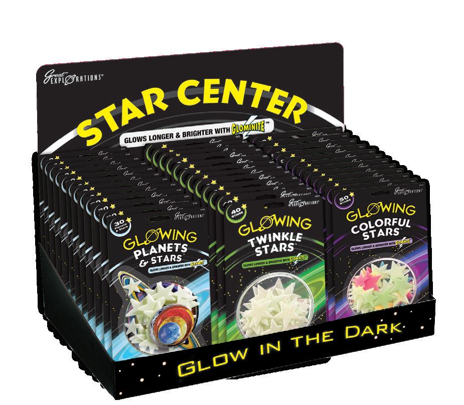 Light up your night with the Wonder Stars Super Kit from Great Explorations. This glow-in-thedark kit includes 150 stars and adhesive putty you can use to stick the stars to your walls and ceiling. Use the star chart to create classic constellations or make your own astronomical formations. ITEM 19491