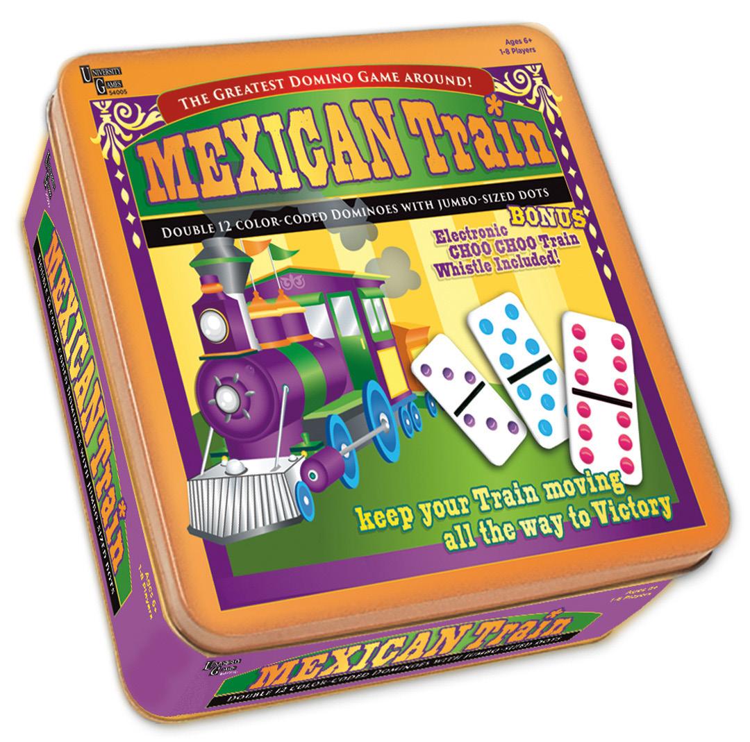 Mexican Train Dominoes is a popular game sometimes known as "Trains." Players work to play all of the dominoes in their hand by placing them on "trains'' from the central station. The felt-lined wood box with sliding top stores a set of double-12 dominoes, 8 cast metal trains, a solid wood train station and score pad.