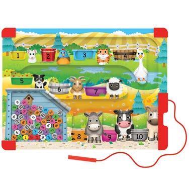 Learn the numbers 1 through 10 by using your magnetic pen and placing all the corresponding-colored number pieces to their proper numbered bins.