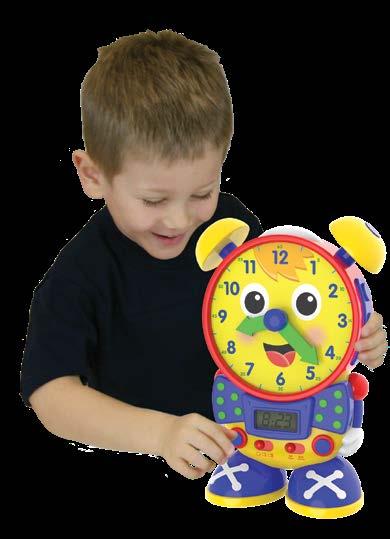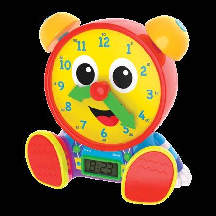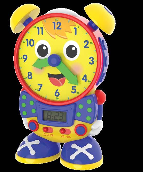 I t’s never too early to learn how to tell time! Let Telly Jr. Teaching Time Clock help your child learn to tell both analog and digital time using two learning modes. In learning mode, Telly Jr. teaches time in five-minute increments when the hands are moved, updating the LCD screen. In quiz mode, Telly Jr. asks your child to move the hands on the clock face to match the time displayed on the screen. When turned off the LCD screen becomes a real working clock! Requires three “AA” batteries (included). Ages 3-6 years.