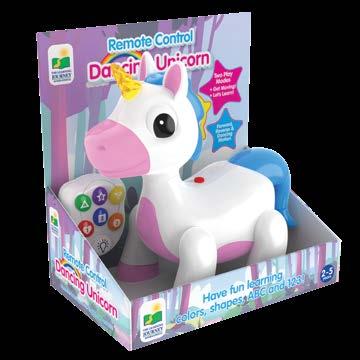 Dance the day away with the Infrared Remote Control Dancing Dino, Unicorn, and Dragon. These whimsical and magical creatures will bust a move and become everyone’s favorite pets. With flashing lights and fun sound effects, these friends will guide kiddos through learning with two play modes – Get Moving! and Let’s Learn! In Get Moving! mode, you can move your pal forward and backward and make it dance! In Let’s Learn! mode, the creature will ask questions about the ABCs, numbers, colors, and shapes. Your child will experience so much fun packed into these smart friends who will teach them and get them moving. Requires four “AA” batteries (included) for the main unit and two “AA” batteries (not included) for the remote control. Ages 2-5 years.