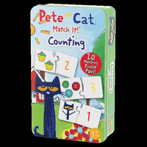 Pete The Cat Match It! Game Tins teach kids about colors and counting using Pete’s friends and other objects featured in his books in a fun and interactive way. Each card has two pieces - a picture of objects and a matching card that spells the color or number of the objects. By simply matching the pieces together, children will learn to recognize the spelling of simple words, learn their colors, and practice their counting skills. The puzzle pairs are self-correcting—only correct object and name combinations will fit together. Each set contains 20 matching puzzle pairs. Recommended for ages 3+ years. Pete the Cat ©️ 1999, 2010 Pete the Cat, LLC.