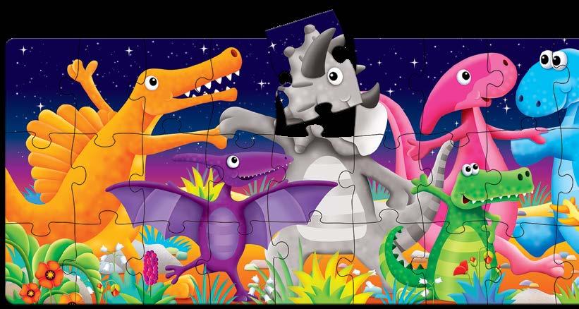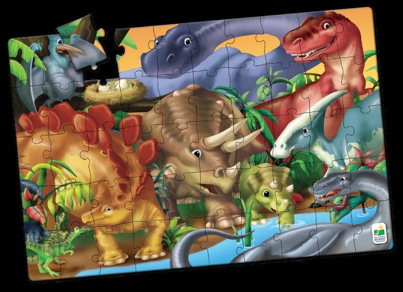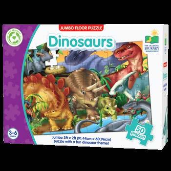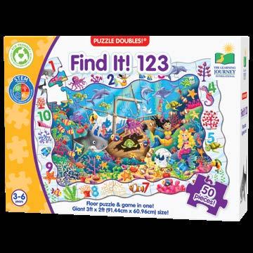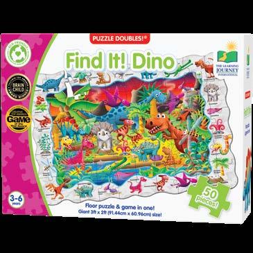 Enjoy two fun-filled playtime activities in one! Each Find It! product combines a puzzle and game into one highly educational, interactive learning experience. The Find It! series teaches children about dinosaurs and 123s. First assemble the puzzle, then play the game by finding the images on the puzzle border within the puzzle image. Each 50-piece puzzle measures a giant 3’ x 2’ (91.44cm x 60.96cm)! Ages 3-6 years.