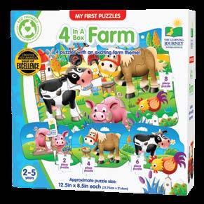 My First 4-In-A-Box® Puzzle Sets are great “starter” puzzles and will help little hands develop their fine motor skills. My First 4-InA-Box® Puzzle Sets contain four puzzles depicting fun characters and concepts that your young ones will easily recognize. The puzzles progress from two pieces to four pieces to six pieces to eight pieces, giving your child the opportunity to grow with the set as they grow and develop. My First 4-In-A-Box® Puzzle Sets are a great way to help your toddler begin building their tactile and problem solving skills. Each puzzle measures approximately 12.5” x 8.5” (31.75cm x 21.59cm). Ages 2-5 years.