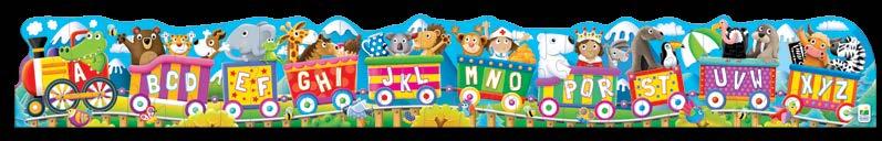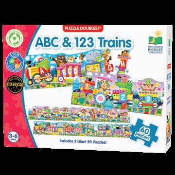 Puzzle Doubles! ABC & 123 Trains box includes two five-foot (152.4cm) long, 30-piece colorful cargo train puzzles teaching the alphabet, counting, and number recognition. Ages 3-6 years.