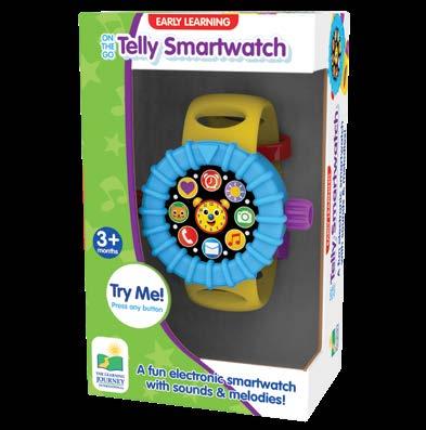 Let’s get busy and learn all the time with the On The Go Telly Smartwatch. This pretend smartwatch looks like the real thing with a light up screen, easy to grasp band, and lots of activities for your little one to explore. Press the side buttons for songs, lights, and sounds. The toggle switches, turn dial, and clacker bands provide tactile activities that strengthen coordination and small motor skills. Requires three button cell (AG13 or LR44) batteries (included). Ages 3 months - 4 years.