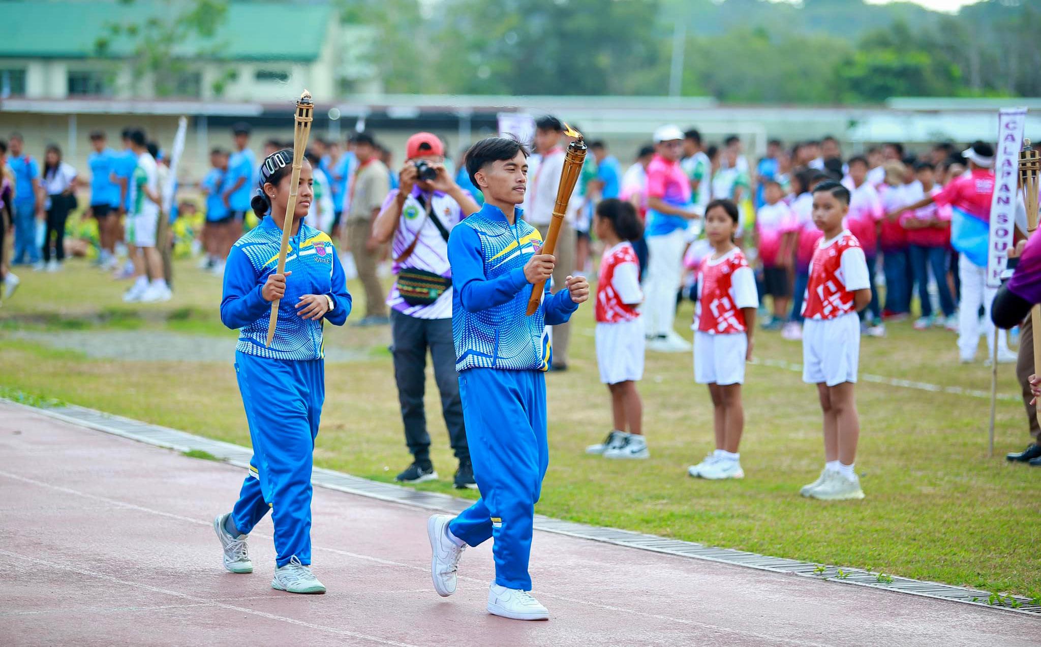 Andrea Acuzar (left) runs to pass the torch to co-Palarong Pambansa delegate in the torchlighting ceremony of the Calapan City Athletic Meet 2024.