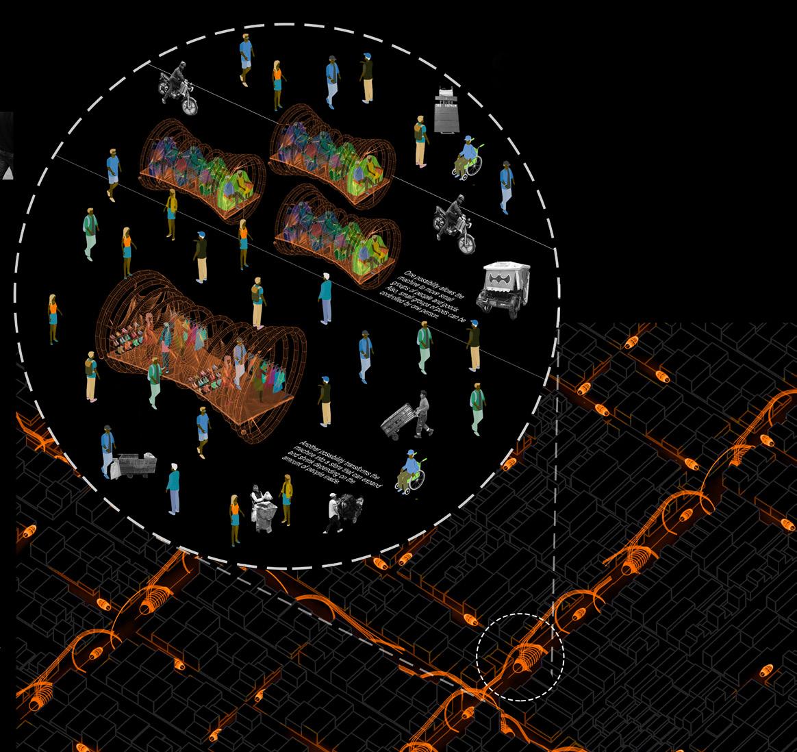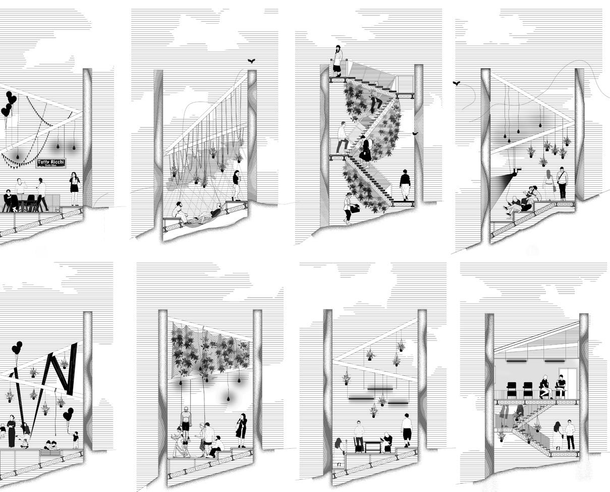 The analysis of transport logics in the Gamarra Commercial Center reflects that there is a tradition of unitary transport for people and cargo. This current situation is addressed by the proposal, allowing the Spirail to contract and expand, functioning as both an individual and a public element.
