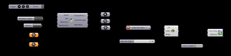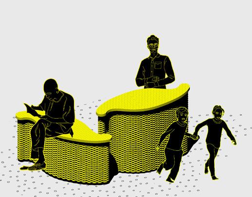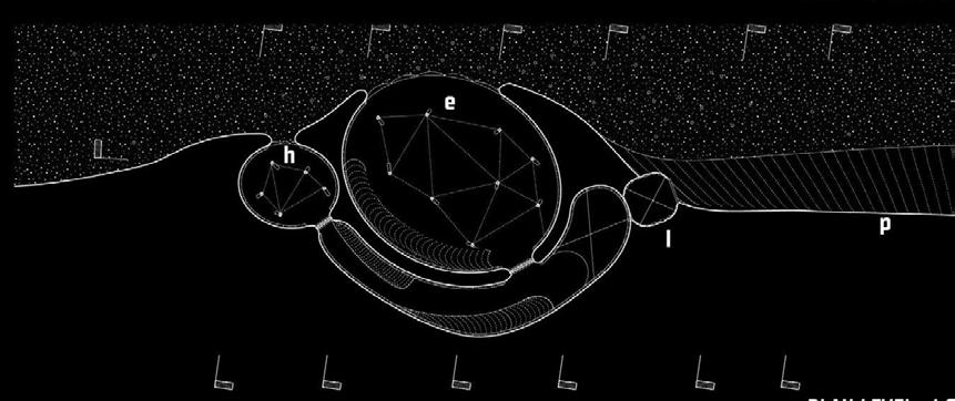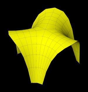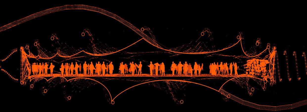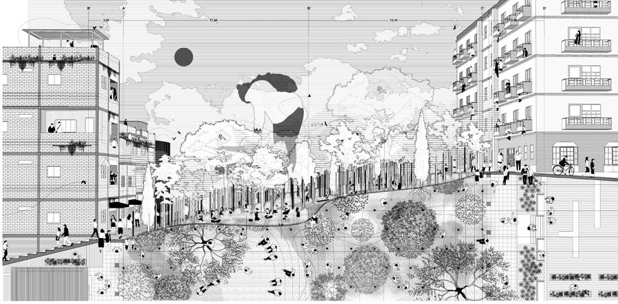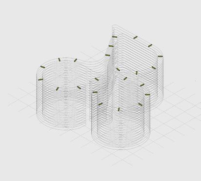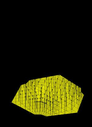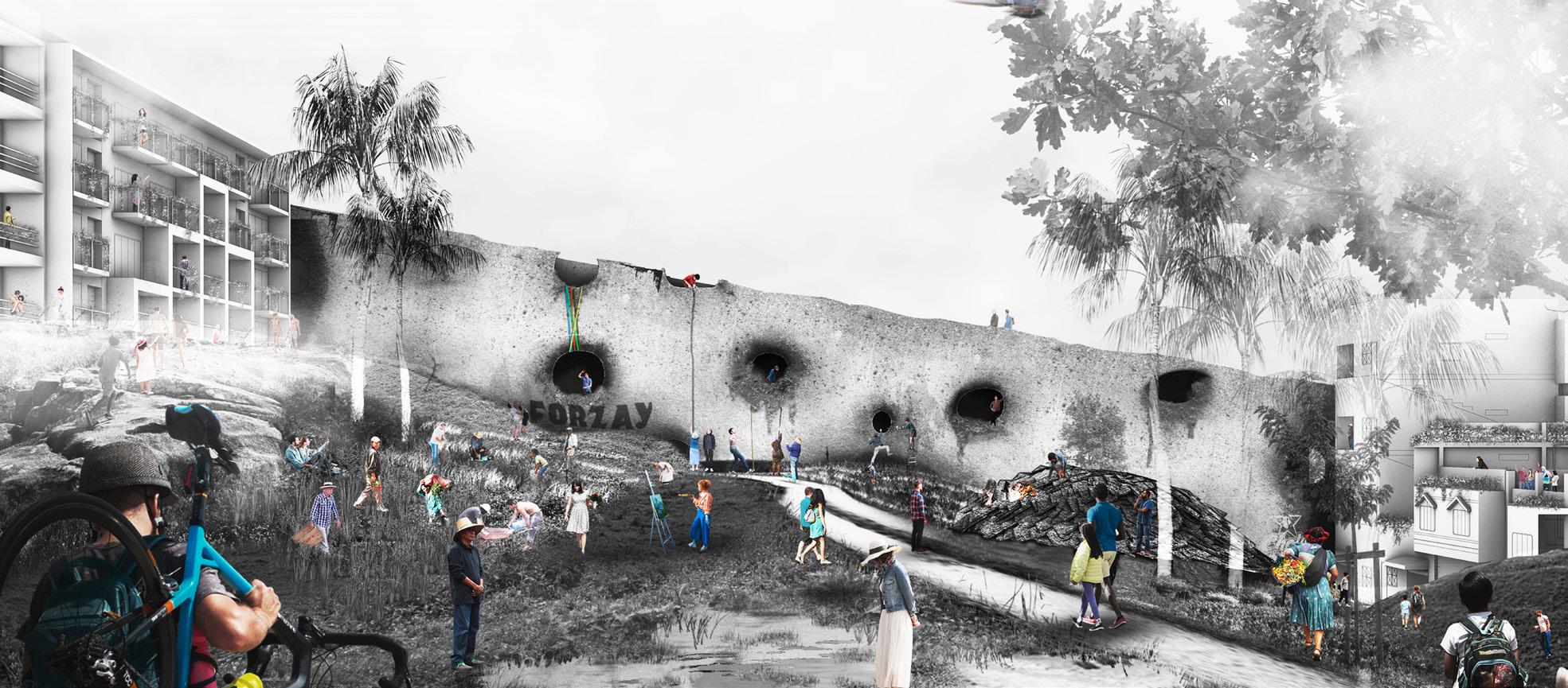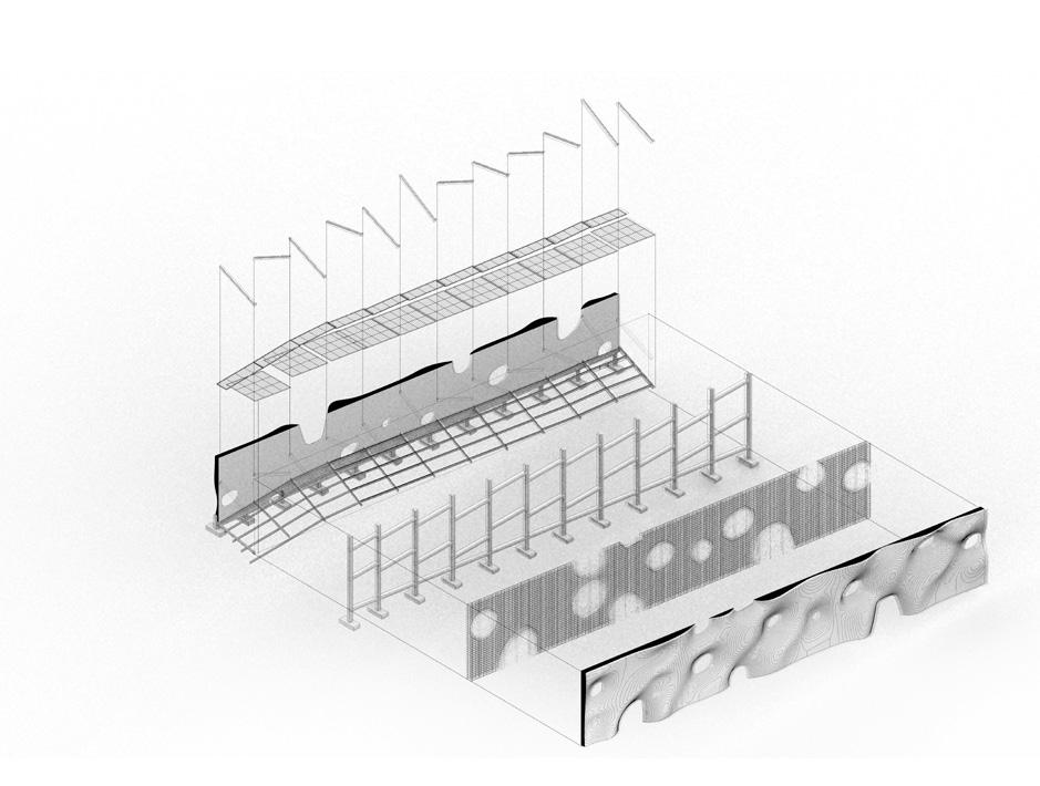 Urban Staples. As sculptural and func- tional elements, literal memories of the wall are erected. However, this new boundary features an organic geometry—as if melting—and per- forations that undermine its divisive mission. t serves as a canvas for community appropriation, with a se- ries of interior platforms that enable a diversity of activities, both local and metropolitan. The physical model is created by means of a pressure si- mulation performed on a subdivided mesh, with the perforations in the wall serving as fixed anchor points.